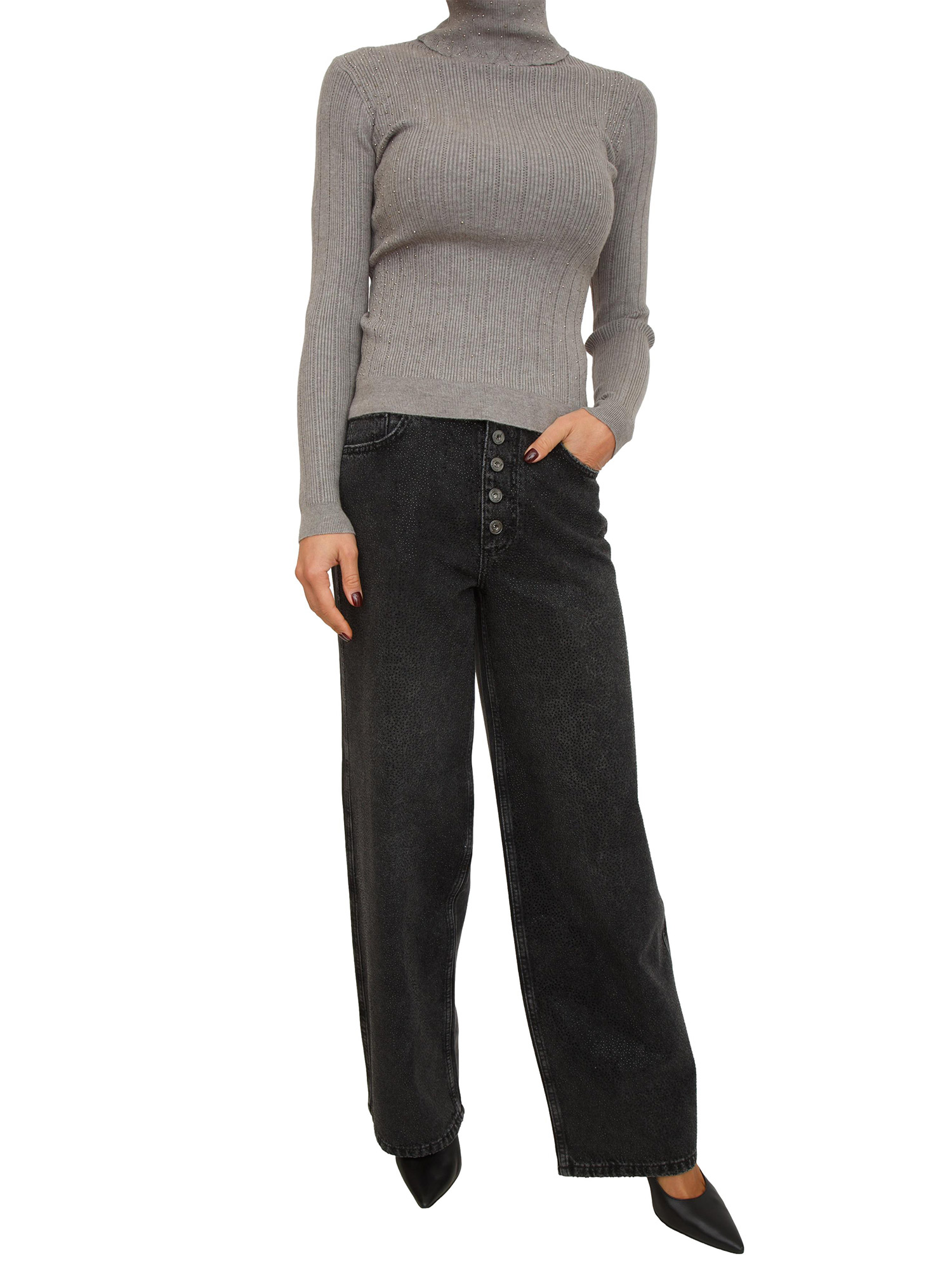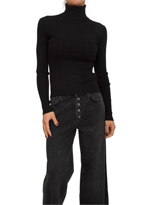 Maglia donna a collo alto Fracomina, realizzata in misto viscosa con lavorazione a costine e strass applicati all over. Design con vestibilità aderente per esaltare la tua femminilità. La modella è alta 1.72 e indossa la taglia S.