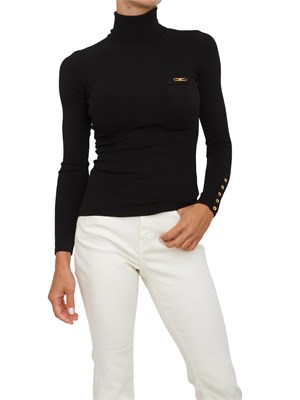Maglia a costine Elisabetta Franchi dalla vestibilità aderente. Con collo dolcevita e maniche con bottoni al fondo, è personalizzata dal taschino in raso con dettaglio logo che regala una nota di luce. La modella è alta 1.72 e indossa la taglia 38.
