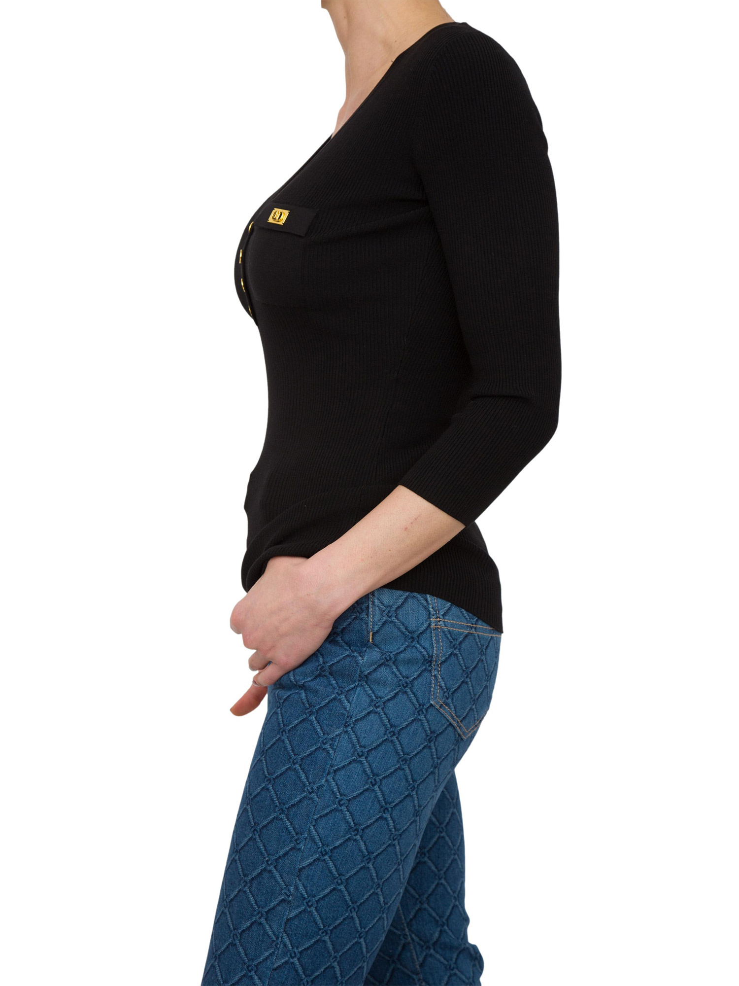 Maglia in misto lyocell e seta, lavorata a micro costine. Con scollo a V e maniche a giro, è impreziosita da bottoni e placca sul taschino in metallo dorato con logo. Vestibilità aderente.La modella è alta 1.72 e indossa la taglia 40.