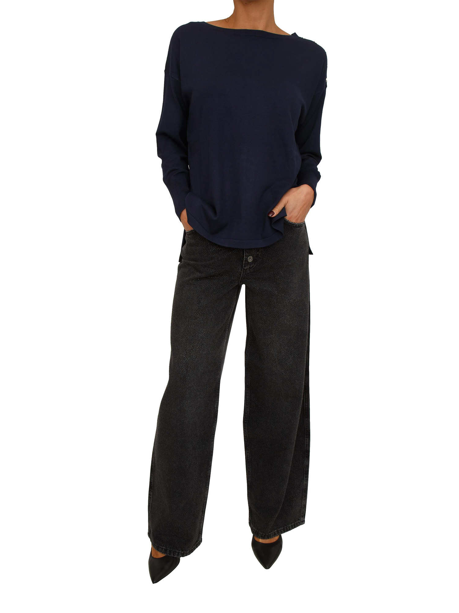 Maglia donna Fracomina realizzata in misto viscosa con scollo a barca e bottoni logati applicati sulle spalle. Modello con spacchetti laterali e maniche scese che donano uno stile contemporaneo e raffinato. La modella è alta 1.72 e indossa la taglia S.