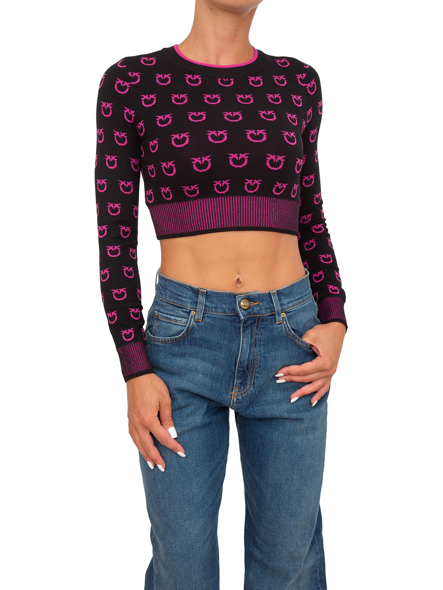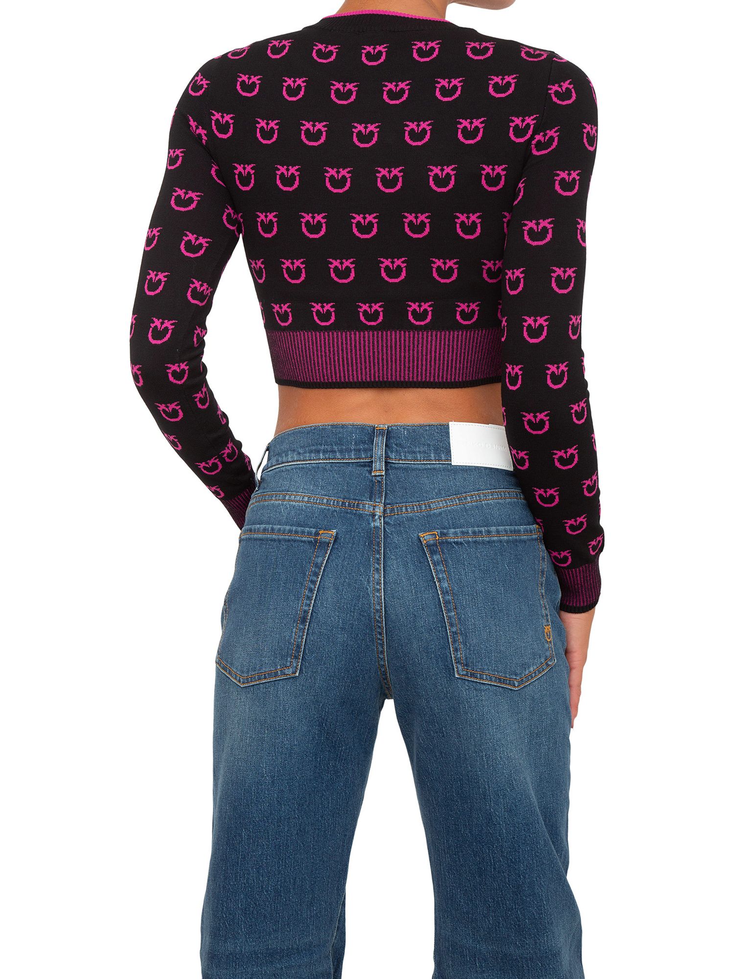 Maglioncino pinko corto dalla linea aderente in maglia di misto lana jacquard con disegno logo Love Birds. Scollo tondo, polsino e fondo capo lavorati a costine.