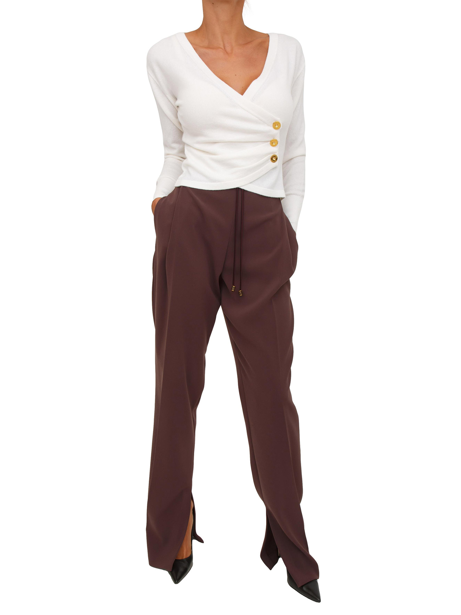 Maglia Elisabetta Franchi in misto cachemire con vestibilità regular. Design con scollo a V incrociato e maniche lunghe. Si distingue per i bottoni in metallo dorato posizionati su un fianco, a esaltare il drappeggio centrale. La modella è alta 1.72 e indossa la taglia 42.