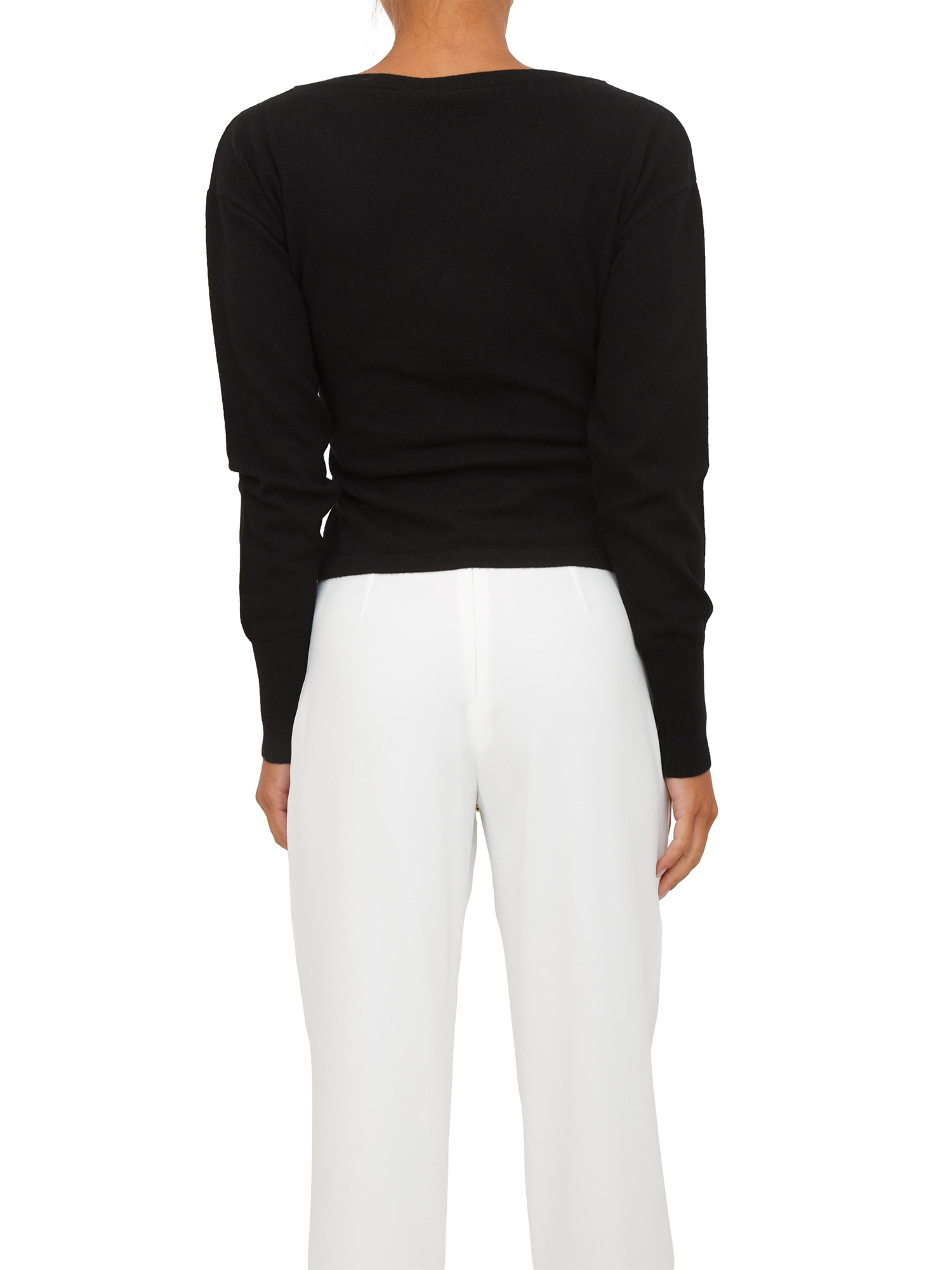Maglia Elisabetta Franchi in misto cachemire con vestibilità regular. Design con scollo a V incrociato e maniche lunghe. Si distingue per i bottoni in metallo dorato posizionati su un fianco, a esaltare il drappeggio centrale. La modella è alta 1.72 e indossa la taglia 42.