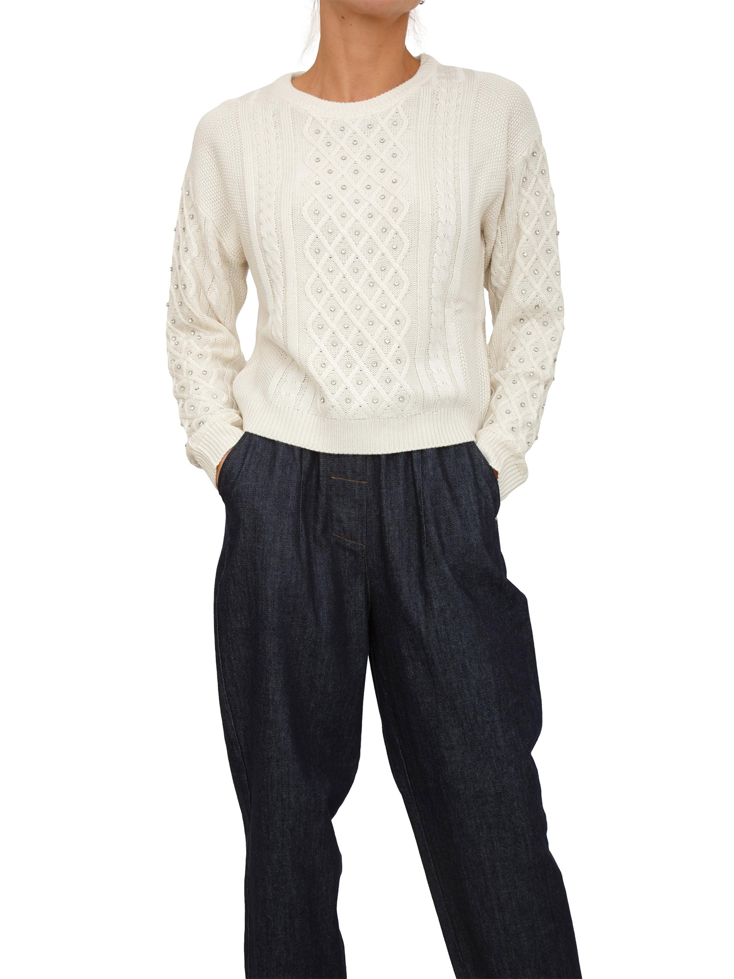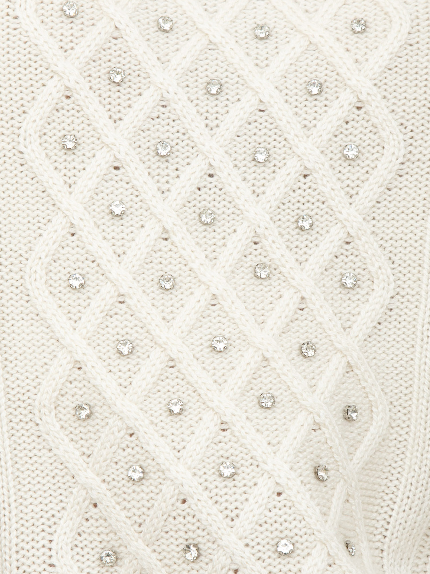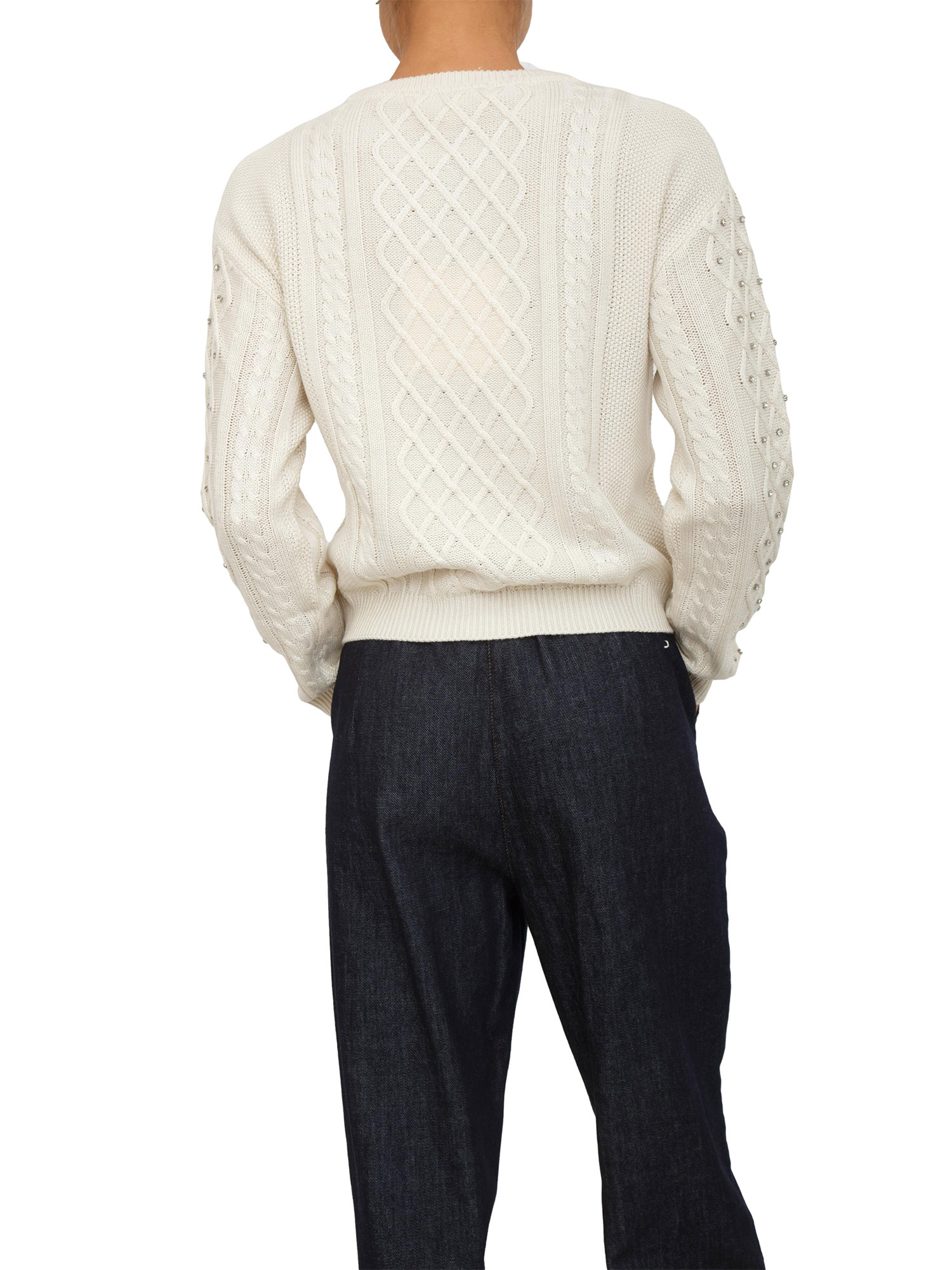 Una pioggia di punti luce scintillanti impreziosiscono questa maglia Emiliana di Kocca caratterizzata da una lavorazione a trecce e rombi. Questo capo presenta scollo rotondo, bordi a costine e giromanica sceso. La modella è alta 1.72 e indossa la taglia S.