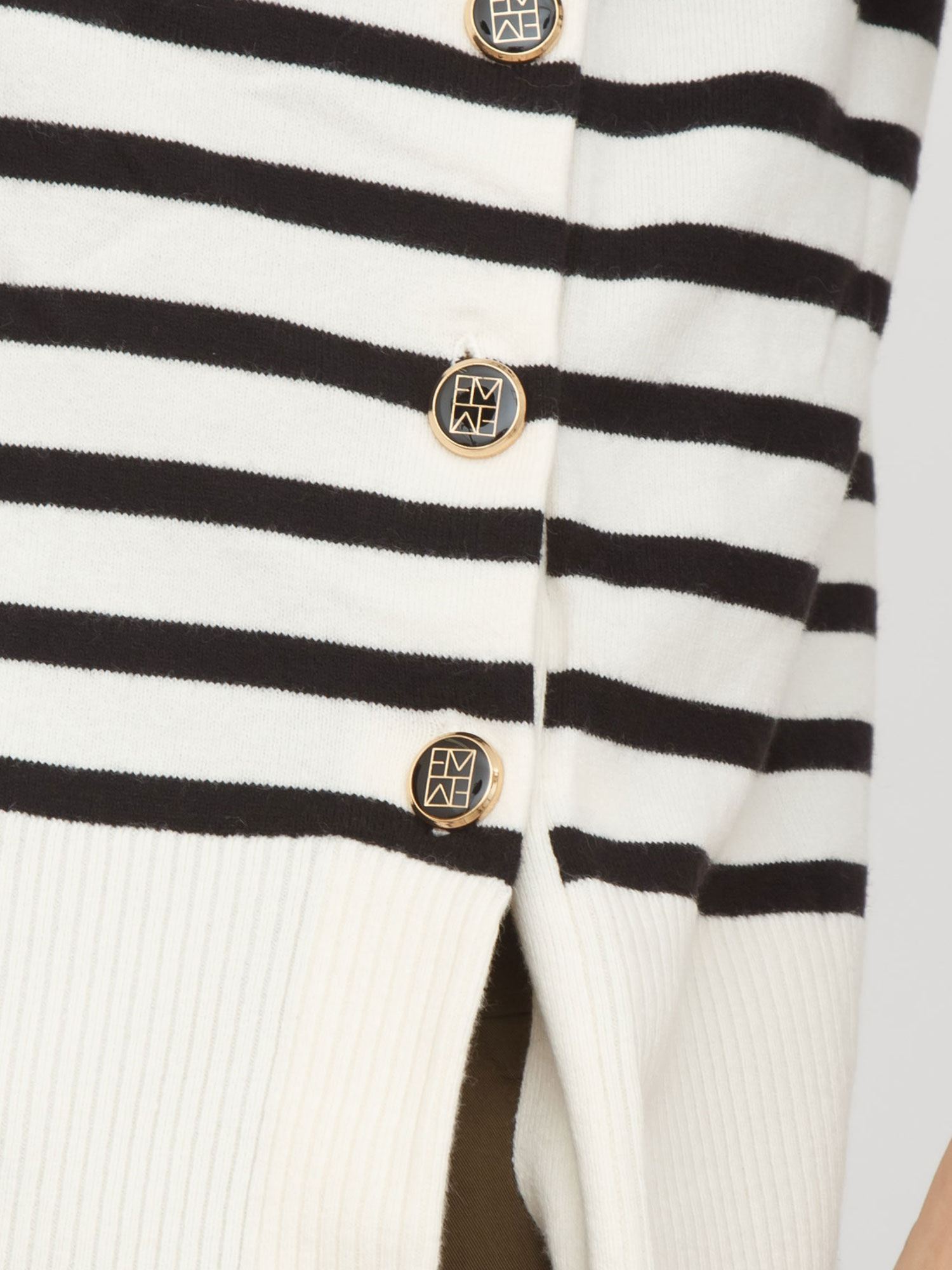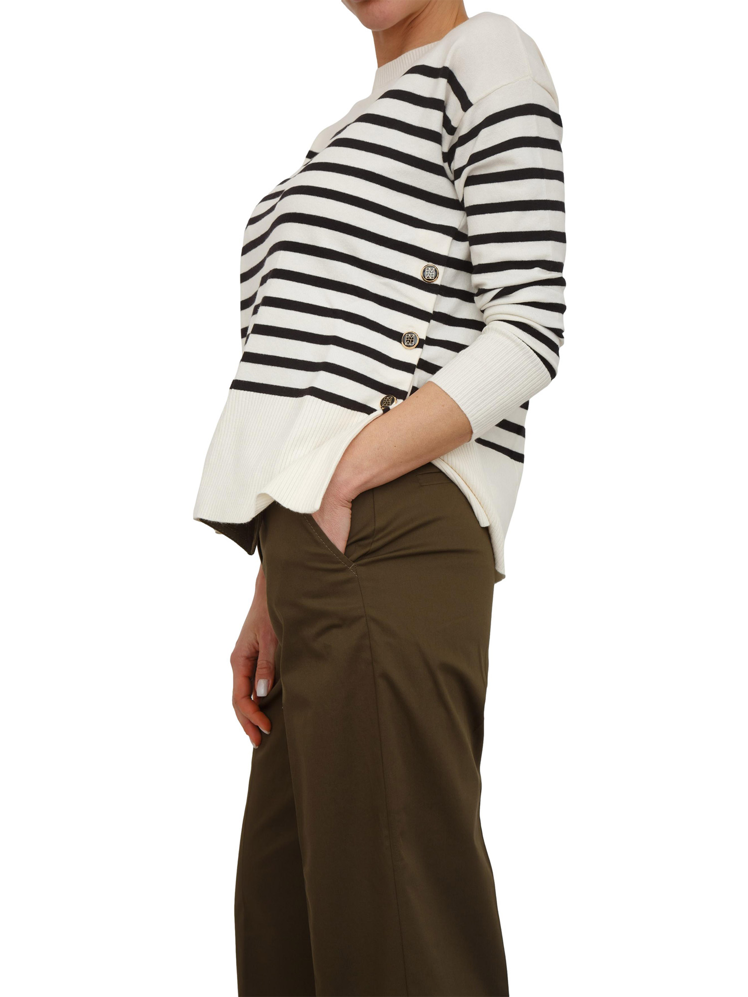 Maglia Emmbadia di Emme Marella realizzata in misto cotone e righe marinière. Design stupendo con ampi spacchi laterali e bottoni logati per un look stiloso. Girocollo e fondi lavorati a costine, maniche raglan e fit regular. Da abbinare a svariati outfit. La modella è alta 1.72 e indossa la taglia S.