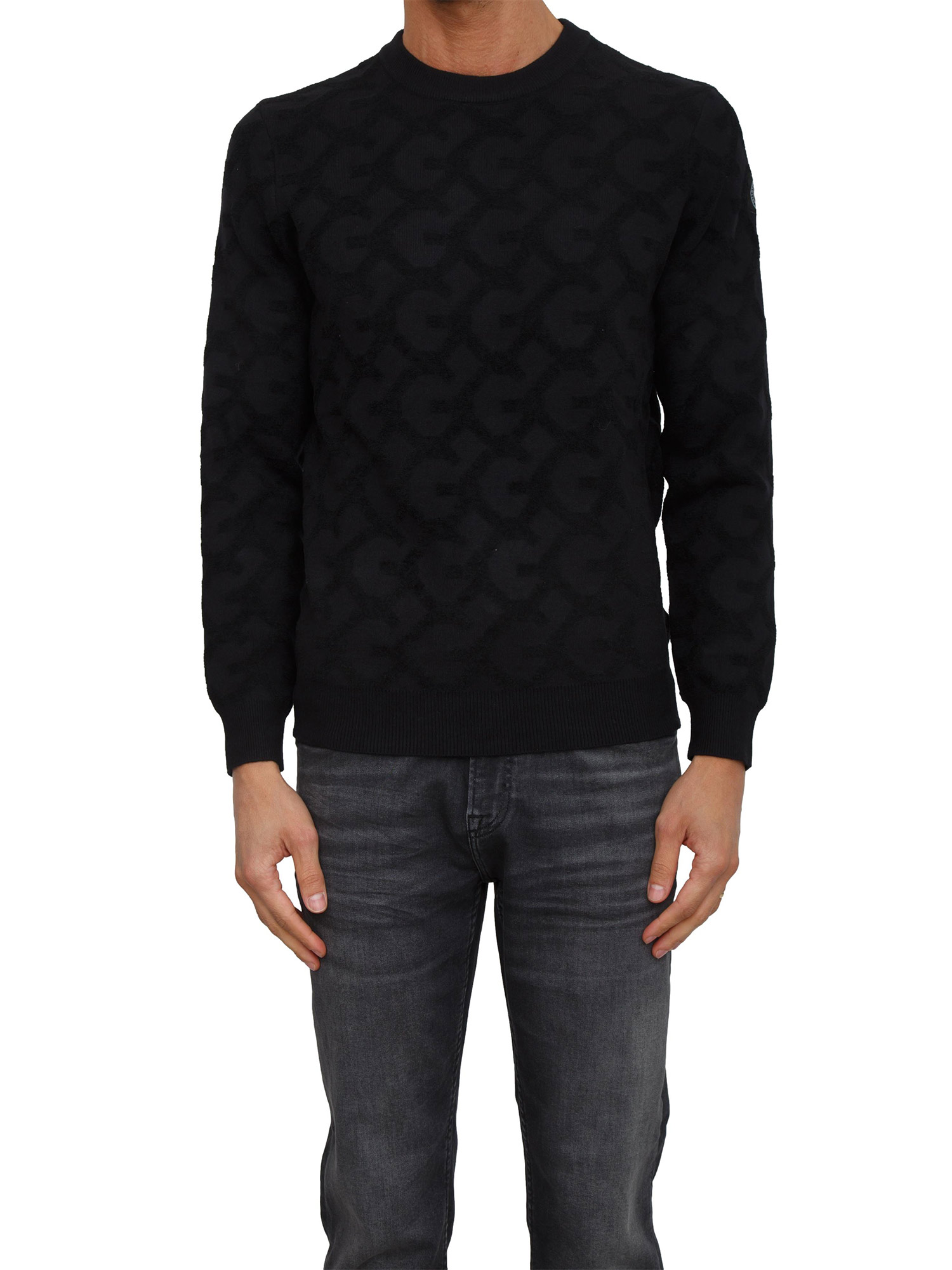 Maglia Guess Jeans uomo realizzata in maglia a lavorazione jacquard con comoda vestibilità regular. Girocollo, polsi e orlo in maglia a costine e patch logo su braccio. Il modello è alto 1.90m e indossa la taglia M.