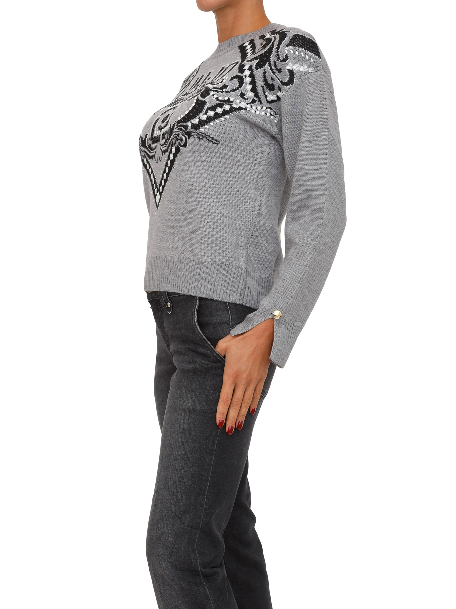 Maglia Liu Jo donna in lana grigia con logo jacquard strass e borchie
