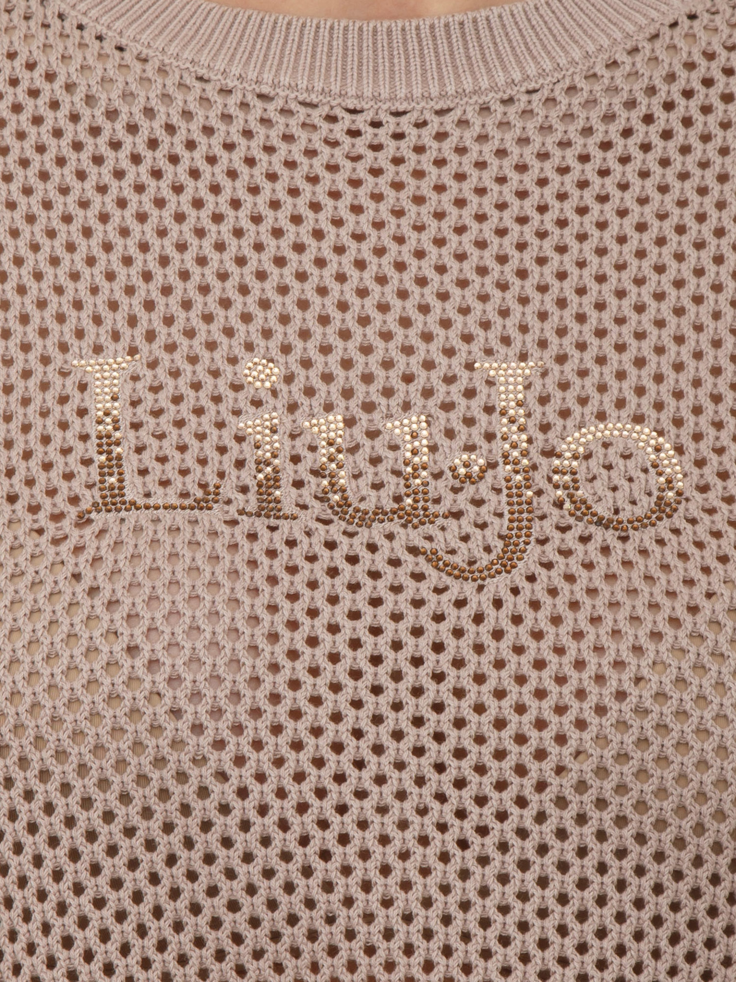 Maglia Liu Jo donna realizzata in tessuto délavé con design traforato sul davanti. Modello a girocollo e maniche lunghe con logo lettering sul davanti ricoperto di strass. La modella è alta 1.72 e indossa la taglia XS.