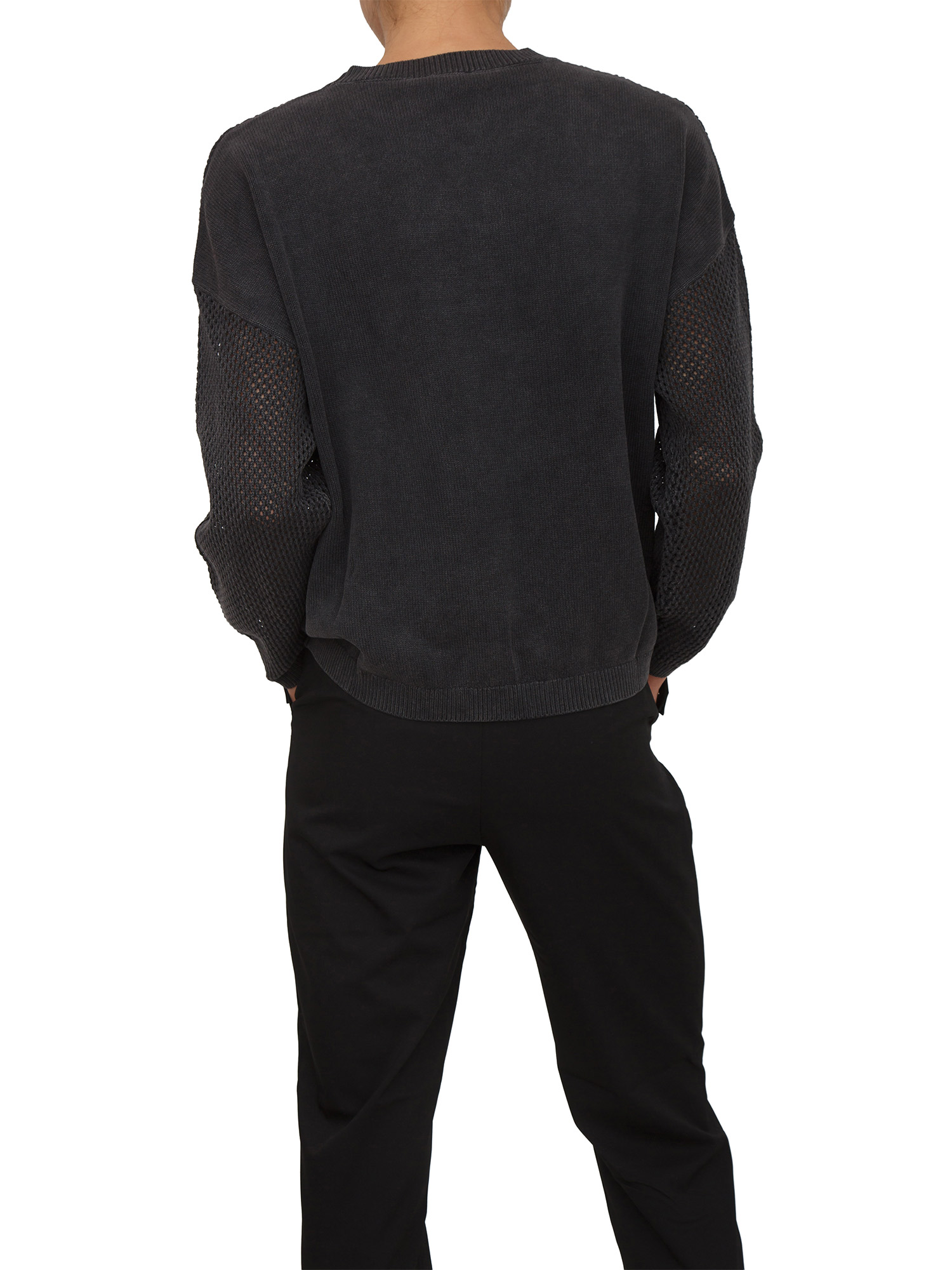 Maglia Liu Jo donna realizzata in tessuto délavé con design traforato sul davanti. Modello a girocollo e maniche lunghe con logo lettering sul davanti ricoperto di strass. La modella è alta 1.72 e indossa la taglia XS.