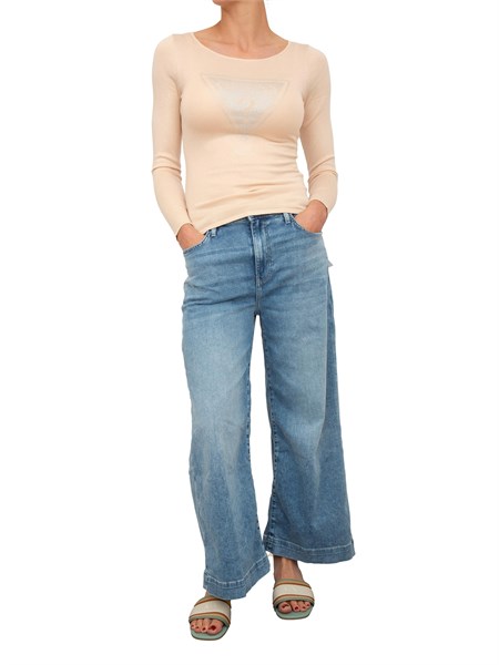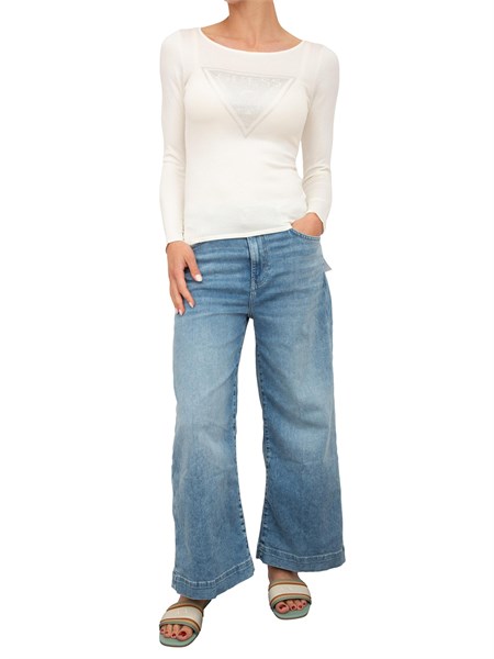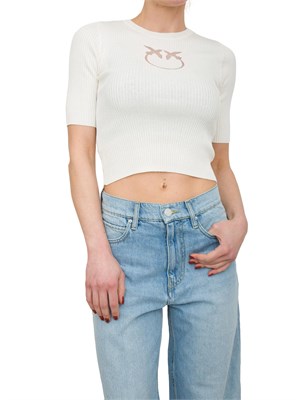 Maglia aderente a mezze maniche in filato di misto seta e cotone lavorato a costine. Personalizzazione con intarsio logo Love Birds davanti, lasciato in trasparenza.