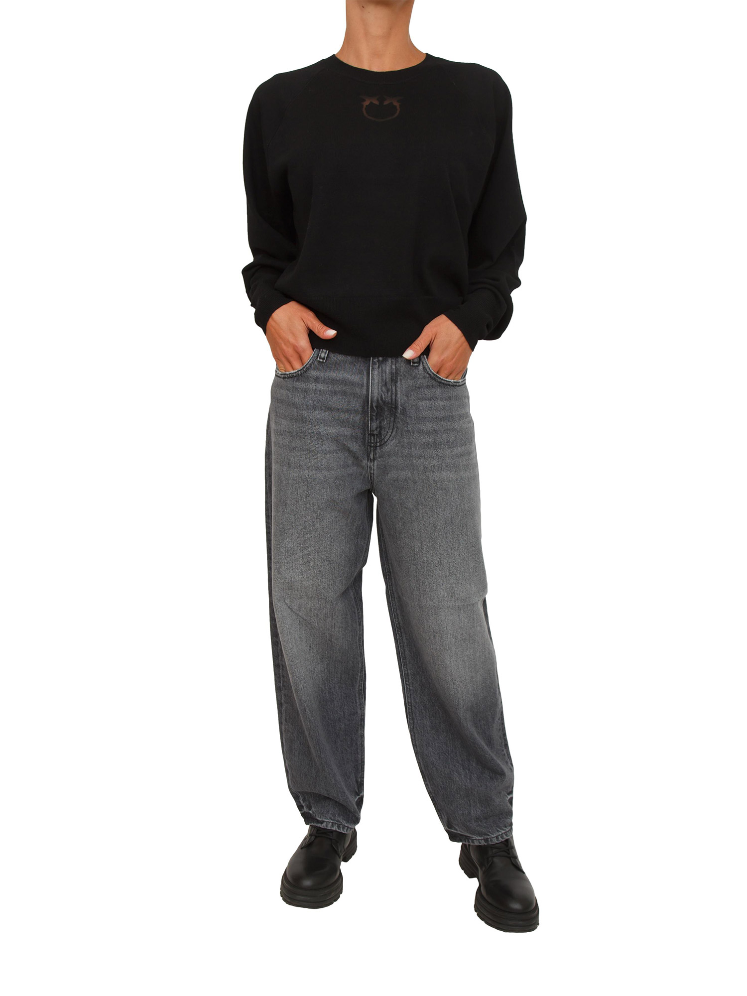 Maglia Pinko modello girocollo a maniche lunghe in pura lana merino, estremamente leggera e versatile. Design con iconico logo Love Birds sotto forma di intarsio in trasparenza lavorato con tecnica dévoré. La modella è alta 1.72 e indossa la taglia S.