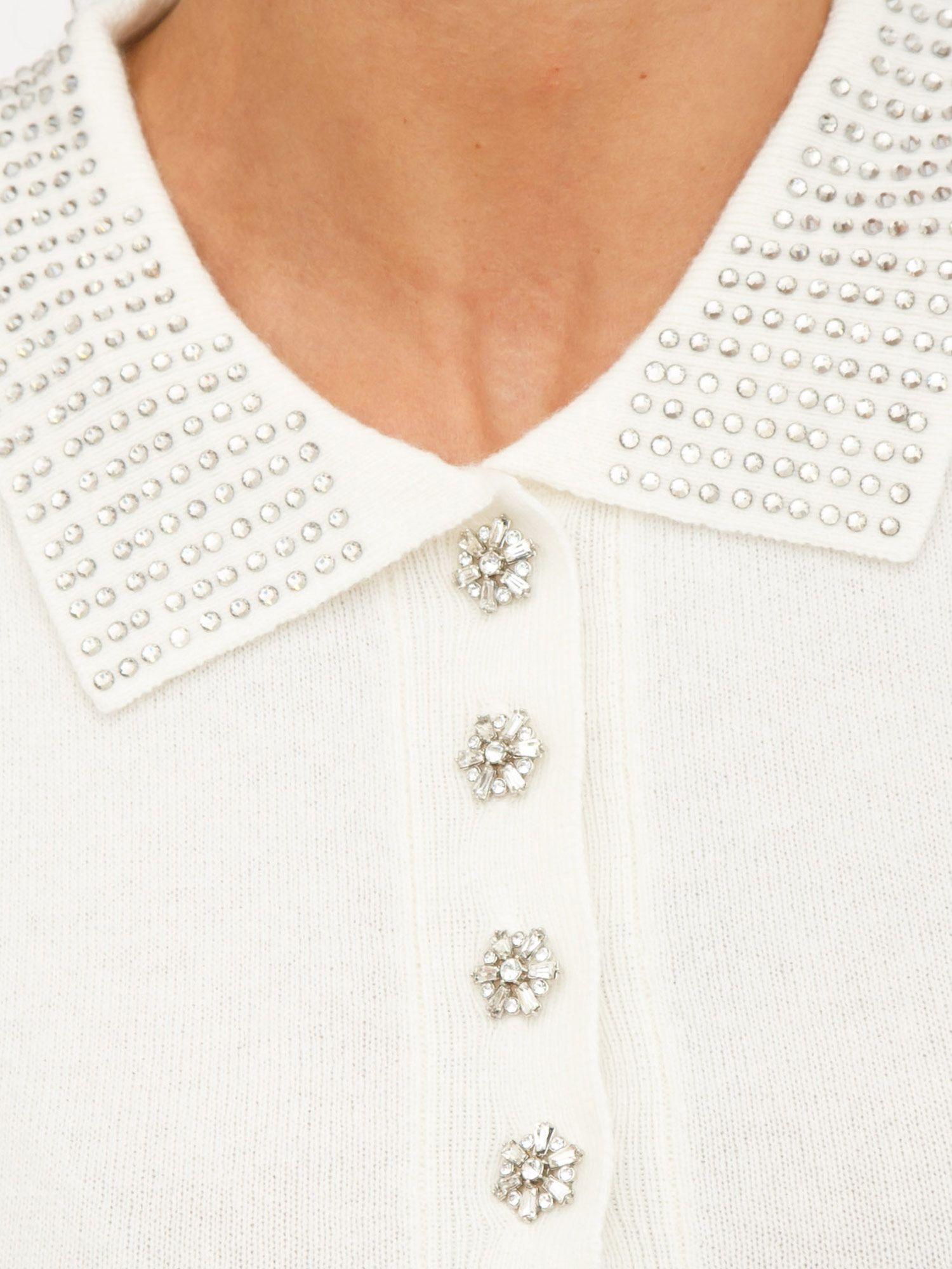 Maglia donna Fracomina modello a polo realizzata in cashmere e lana con vestibilità regular. Design con colletto classico arricchito con strass, bottoni gioiello davanti e lavorazione a costine sui fondi. La modella è alta 1.72 e indossa la taglia S.