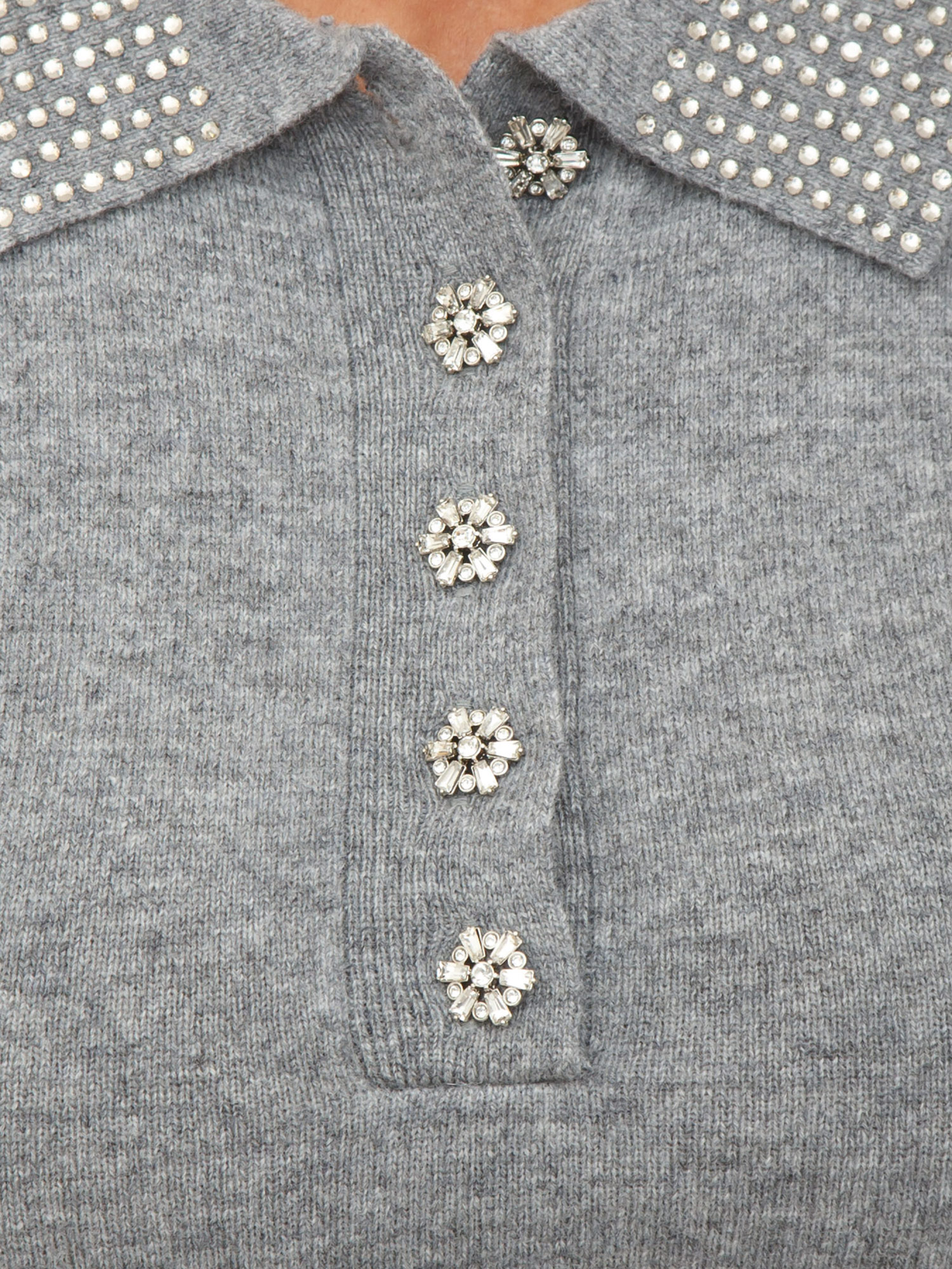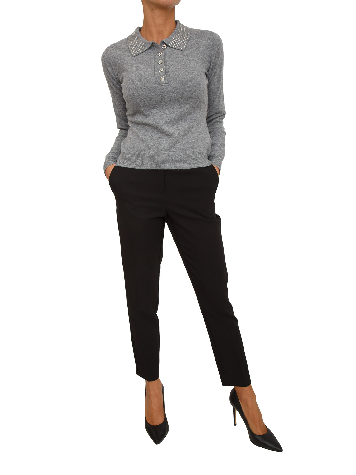 Maglia donna Fracomina modello a polo realizzata in cashmere e lana con vestibilità regular. Design con colletto classico arricchito con strass, bottoni gioiello davanti e lavorazione a costine sui fondi. La modella è alta 1.72 e indossa la taglia S.