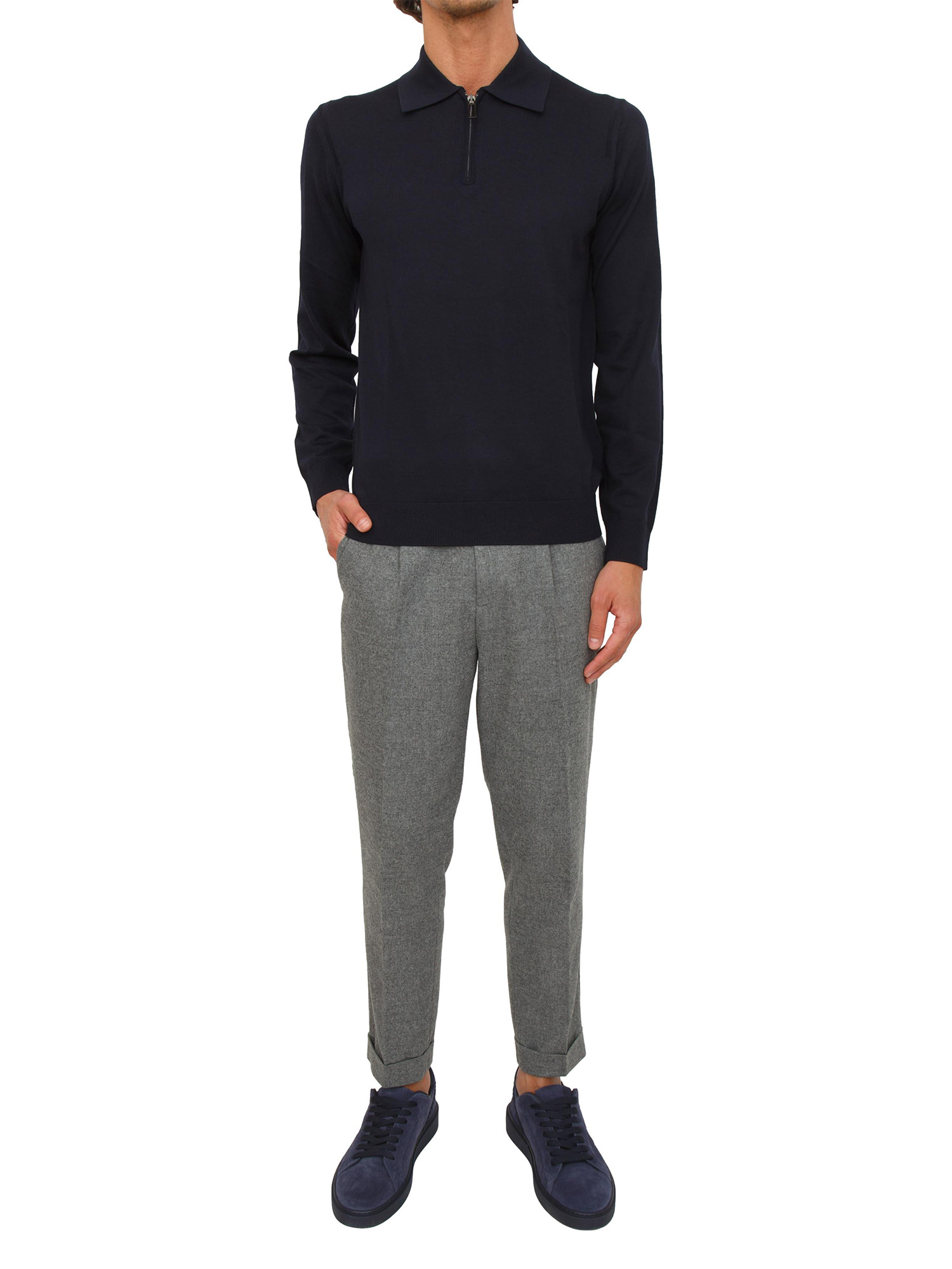 Maglia polo Paolo Pecora in pregiata lana merino extrafine. Il collo a polo con zip a mezza lunghezza aggiunge una nota sportiva e funzionale, mantenendo un carattere elegante e versatile. Un capo essenziale del guardaroba invernale. Il modello è alto 1.90m e indossa la taglia L.