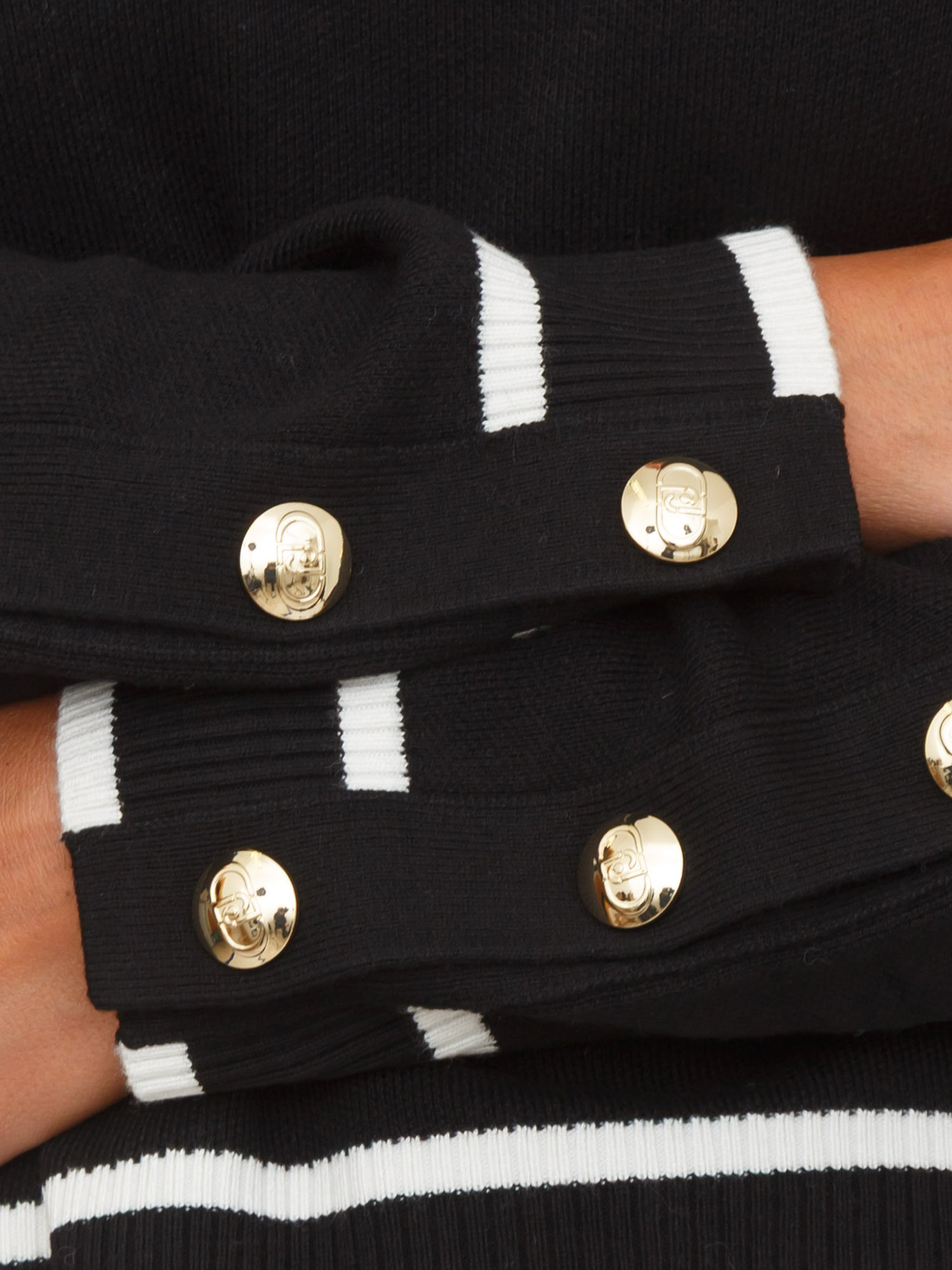 Maglia scollo V Liu Jo donna realizzata in misto seta con fit dritto e morbido. Design con motivo righe a contrasto sui bordi, arricchito da bottoni dorati sulle maniche e logo jacquard a contrasto. La modella è alta 1.72 e indossa la taglia XXS.