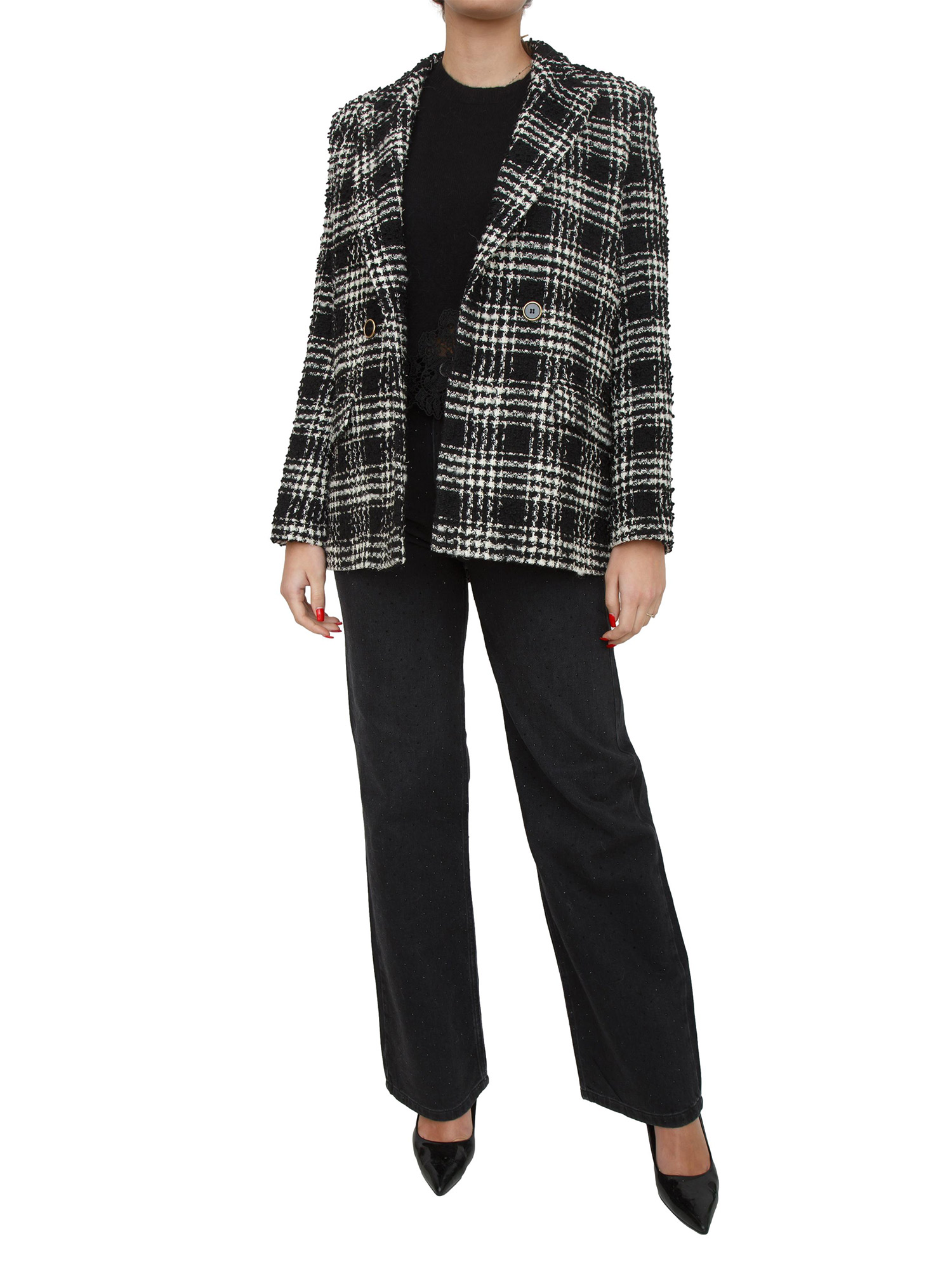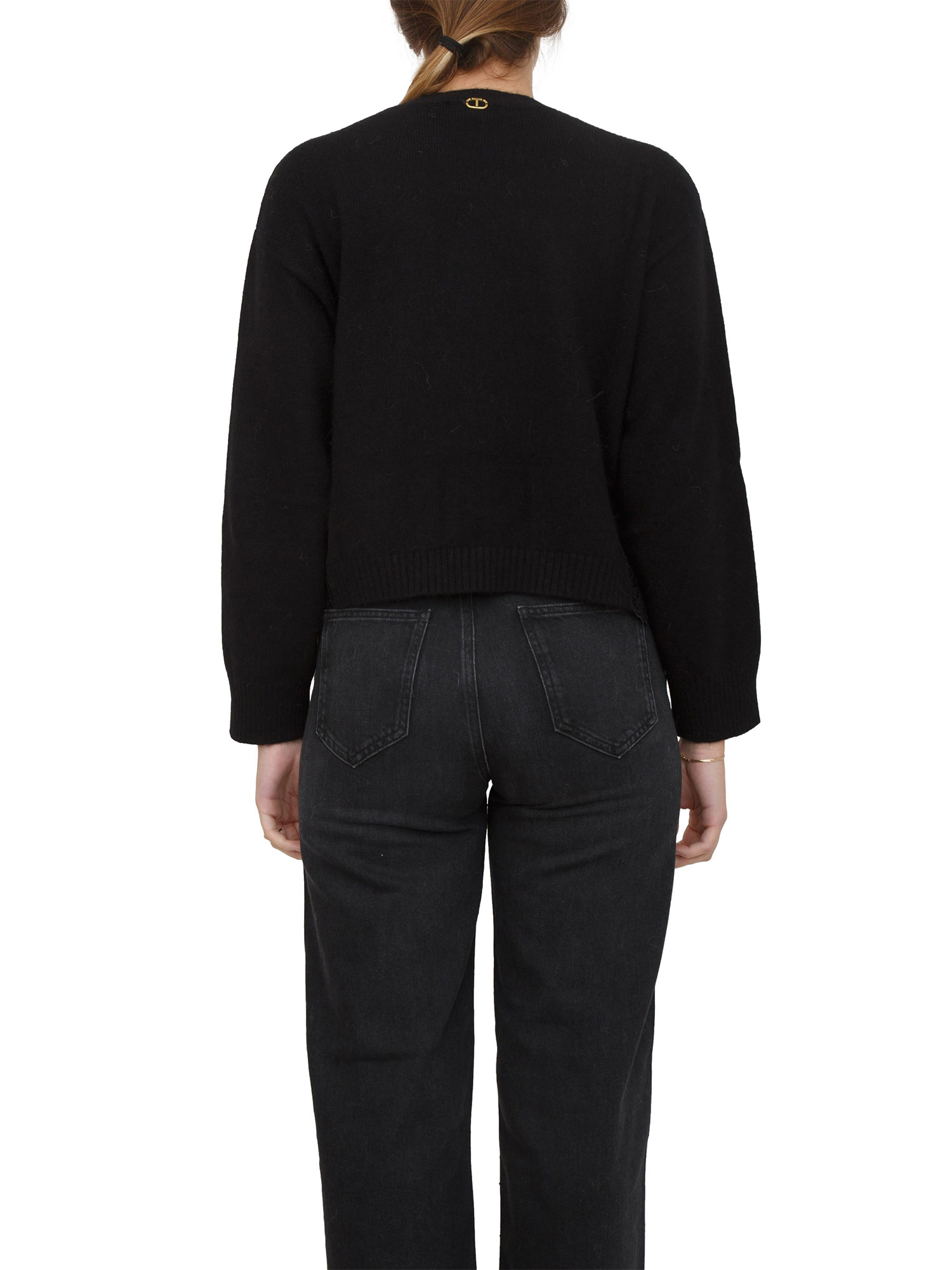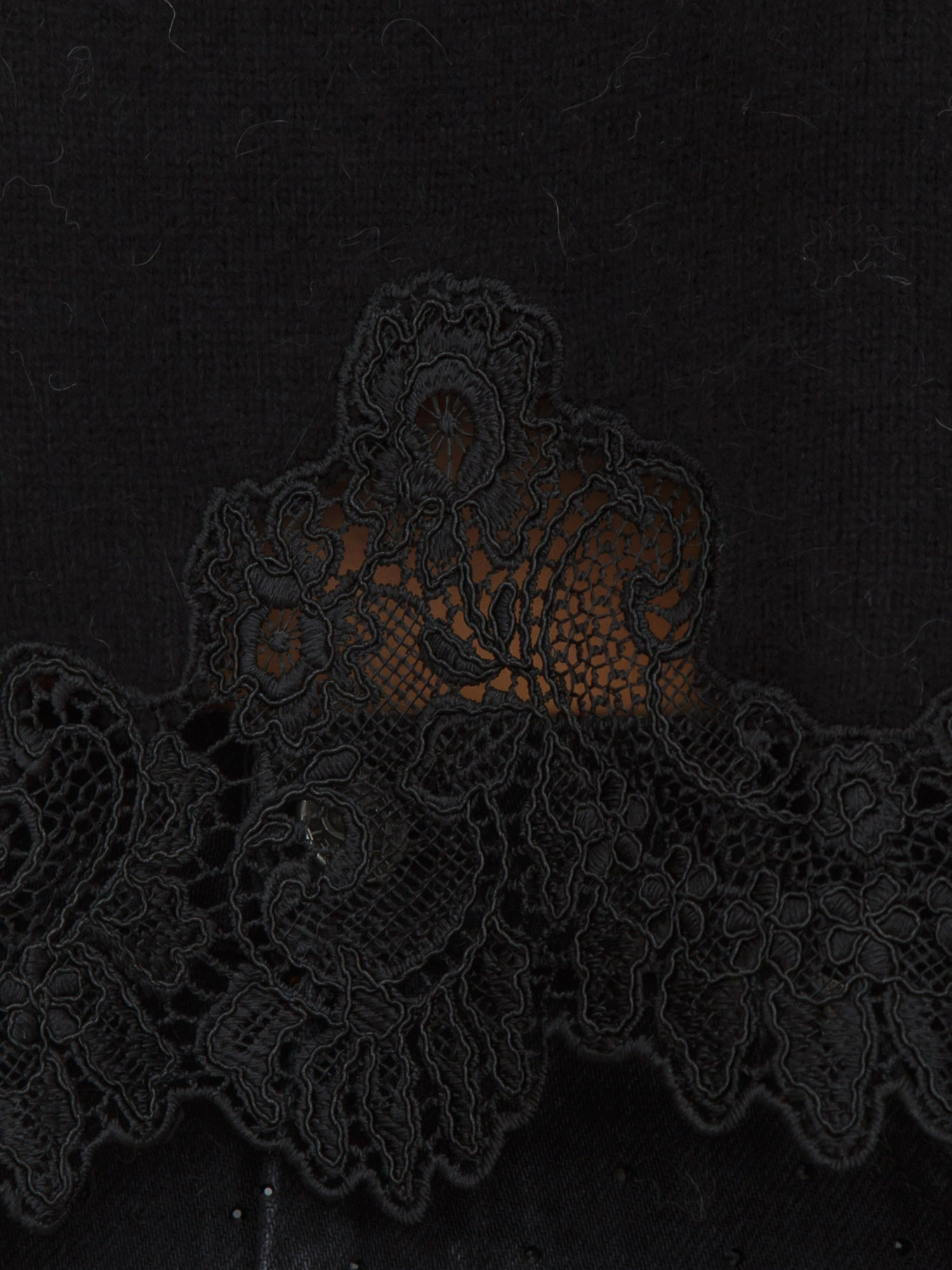 Maglia Twinset in misto angora con ricamo applicato e passamaneria in pizzo smerlato in tono al capo al fondo. Ha lavorazione rasata, collo ondo, maniche lunghe, profili a costine, placchetta logo Oval T sul retro, linea morbida. La modella è alta 1.77 e indossa la taglia S.