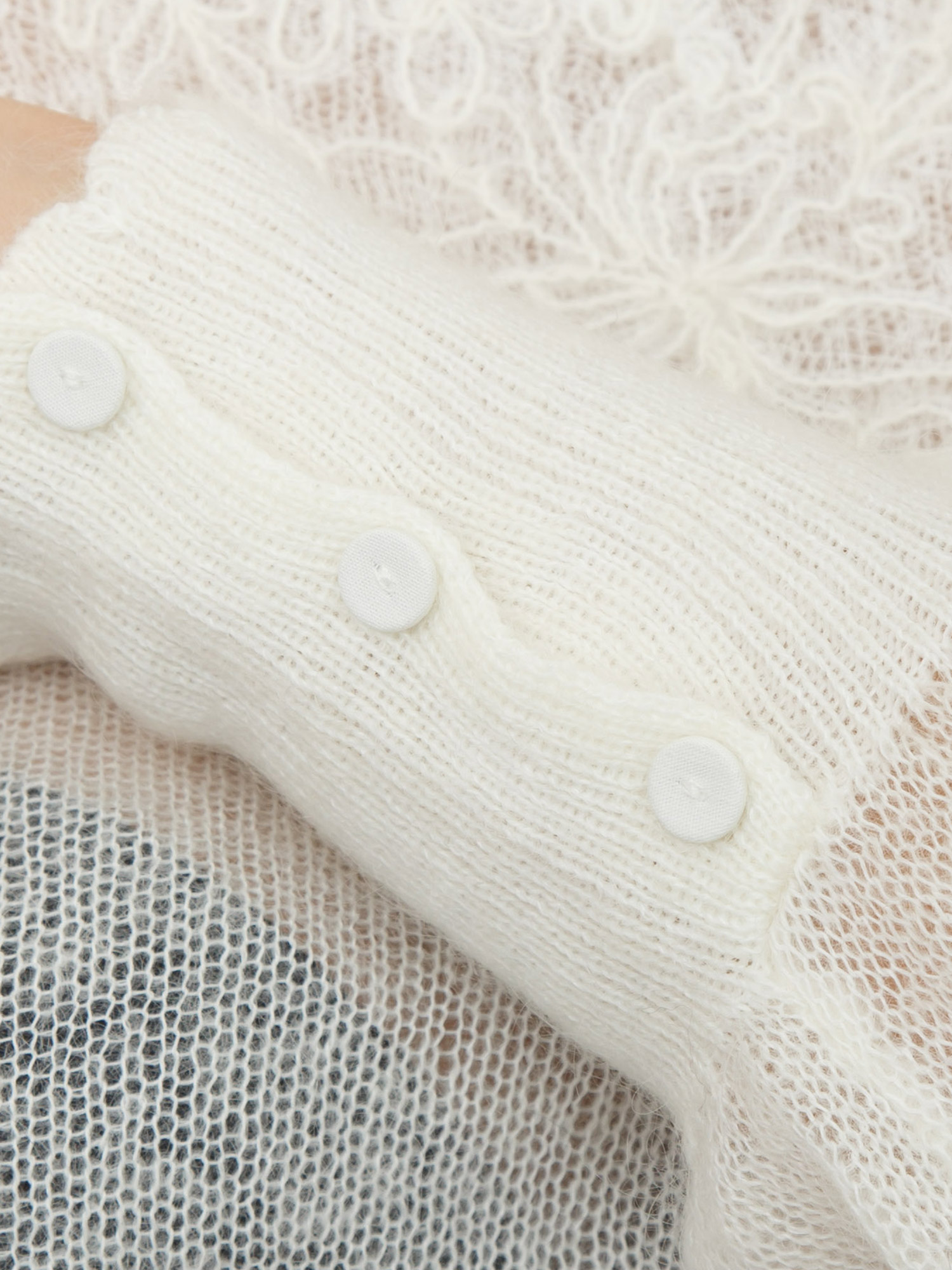 Maglia Twinset realizzata in misto mohair leggermente trasparente con lavorazione floreale romantica sul davanti. Ha collo tondo e polsi smerlati con bottoni, maniche lunghe a sbuffo e fondi rifiniti a costine. La modella è alta 1.77 e indossa la taglia S.