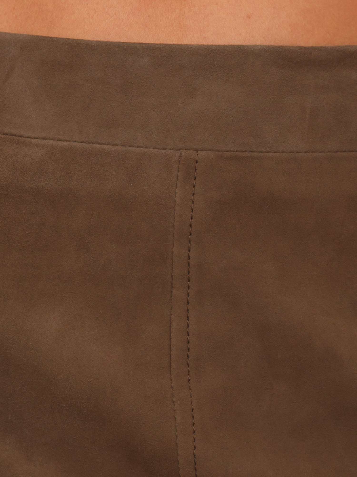 Grintosa e sofisticata, la minigonna Marella realizzata in suede accarezza i fianchi e lascia scoperte le gambe, in un gioco di seduzione da completare con slingback e giacchino coordinato. La modella è alta 1.72 e indossa la taglia 40.