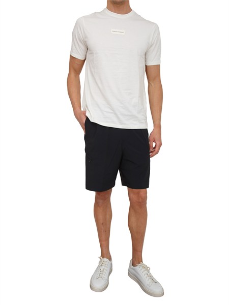 Bermuda EA7 Emporio Armani con logo laterale nascosto da zip, vita elastica con coulisse regolabile e due tasche laterali con chiusura a zip.Il modello è alto 1.90m e indossa la taglia M.