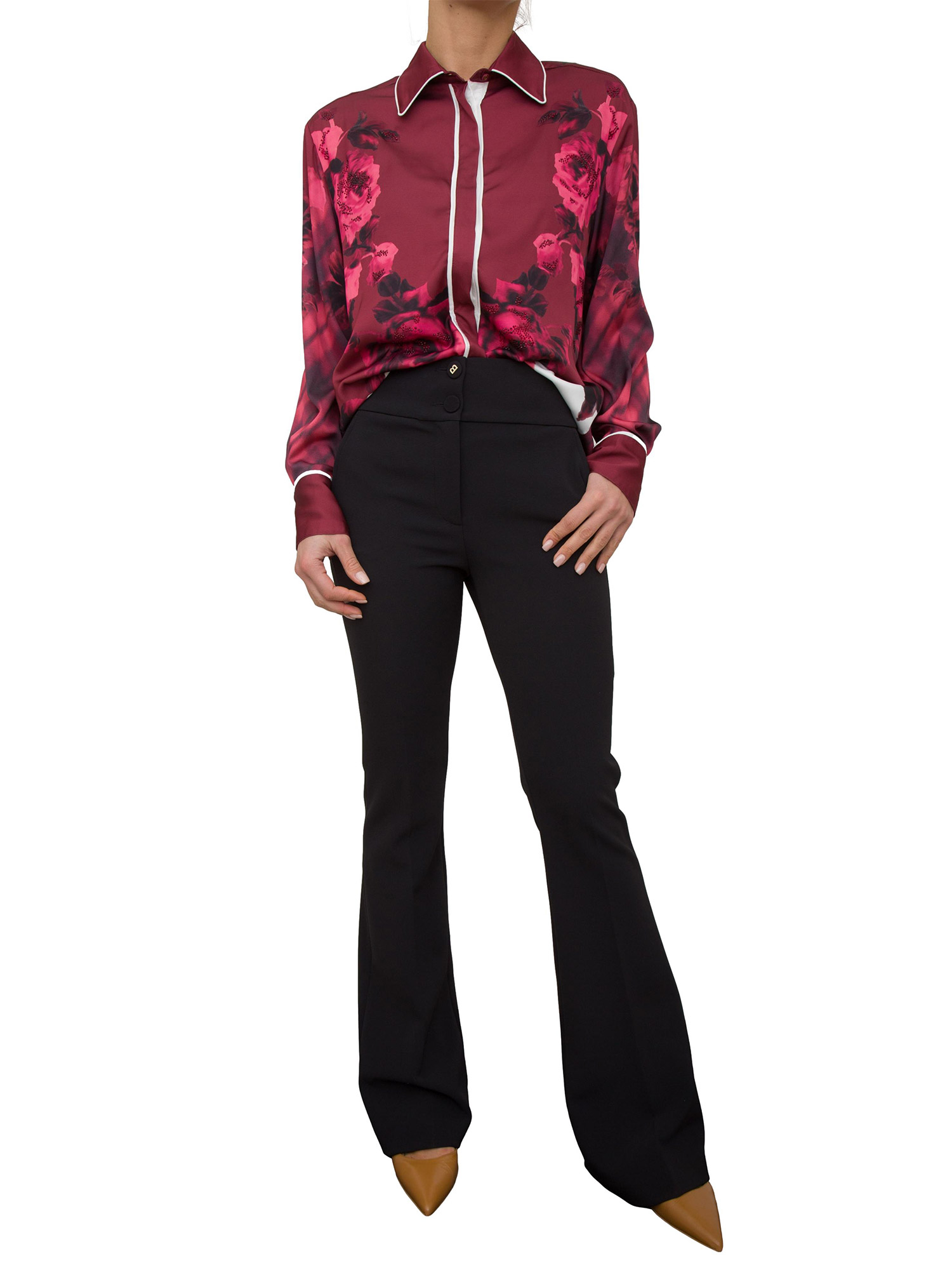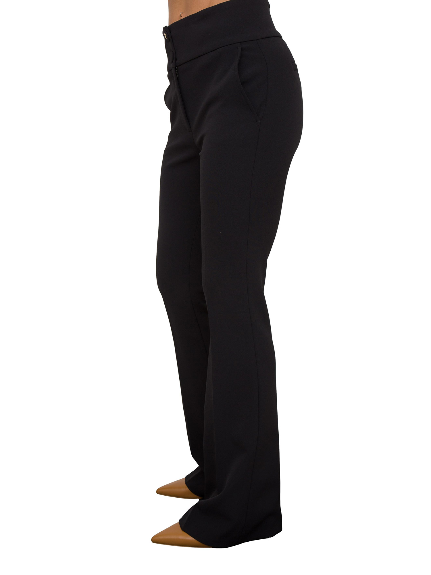 Pantaloni flare Blugirl realizzati in crêpe stretch con elastico in vita sul retro per garantire una migliore vestibilità. Sono un essential dal guardaroba formale femminile, con chiusura a doppio bottone, tasche a filetto e piega stirata. Da proporre in una miriade di look.
