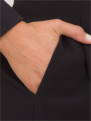 Pantalone dritto in crêpe stretch con doppie pinces sul davanti e tasche a patta sul retro con bottoni in metallo dorato.