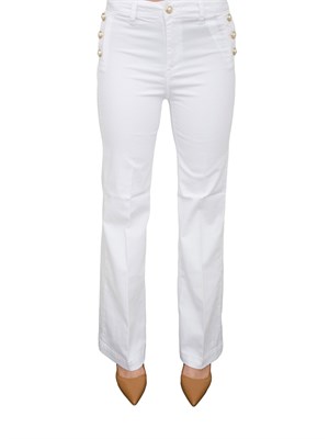 Pantaloni bottom up Liu Jo donna realizzati in gabardina di cotone stretch. Modello a vita alta con gamba flare e tasche sul retro con bottoni gioiello sui fianchi. Completano il design il logo in metallo sul retro, la salpa logata e la chiusura con bottone gioiello e zip nascosta. Ideali per tutti i tuoi outfit casual.