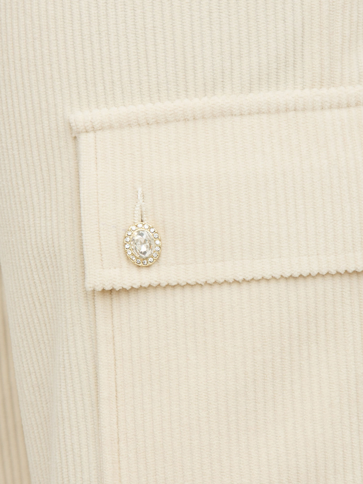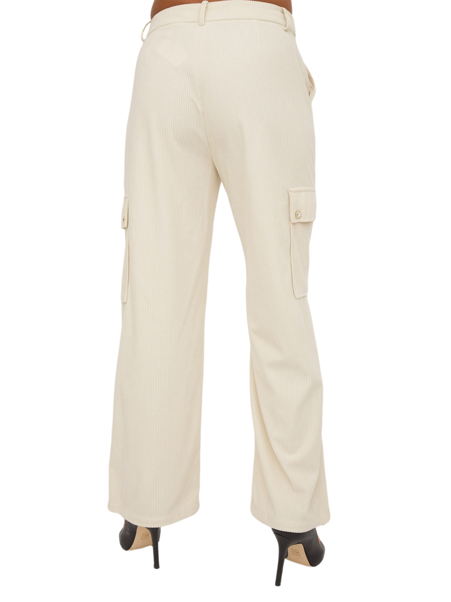 Pantalone cargo da donna LIU JO in velluto a costine, tasche sui fianchi, tasche con patta e bottoni gioiello sui lati, logo in metallo e chiusura con zip nascosta e bottone gioiello.