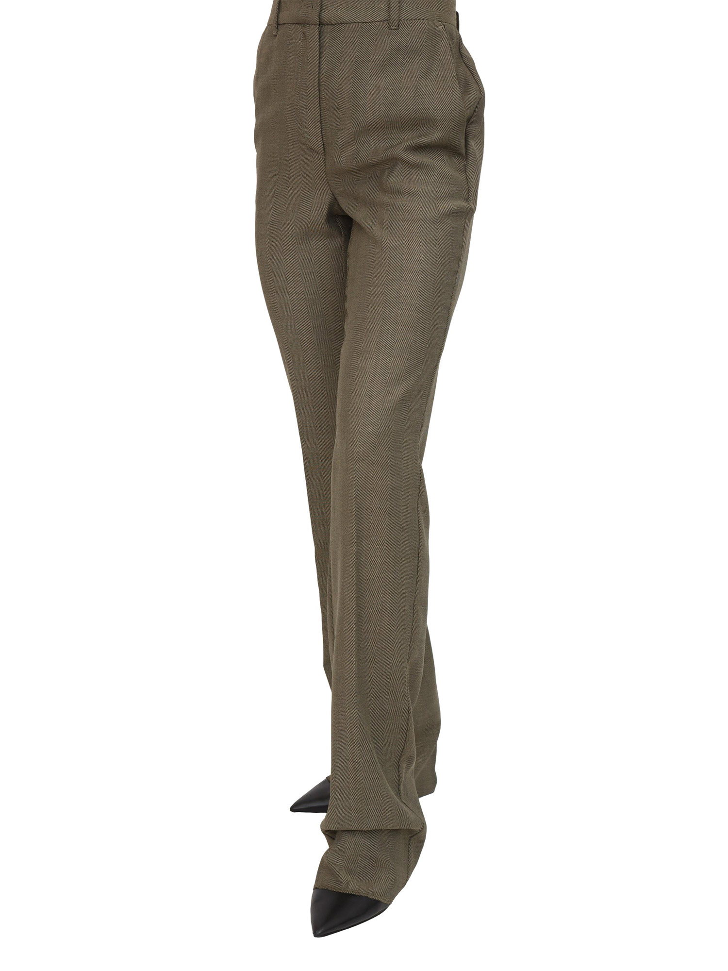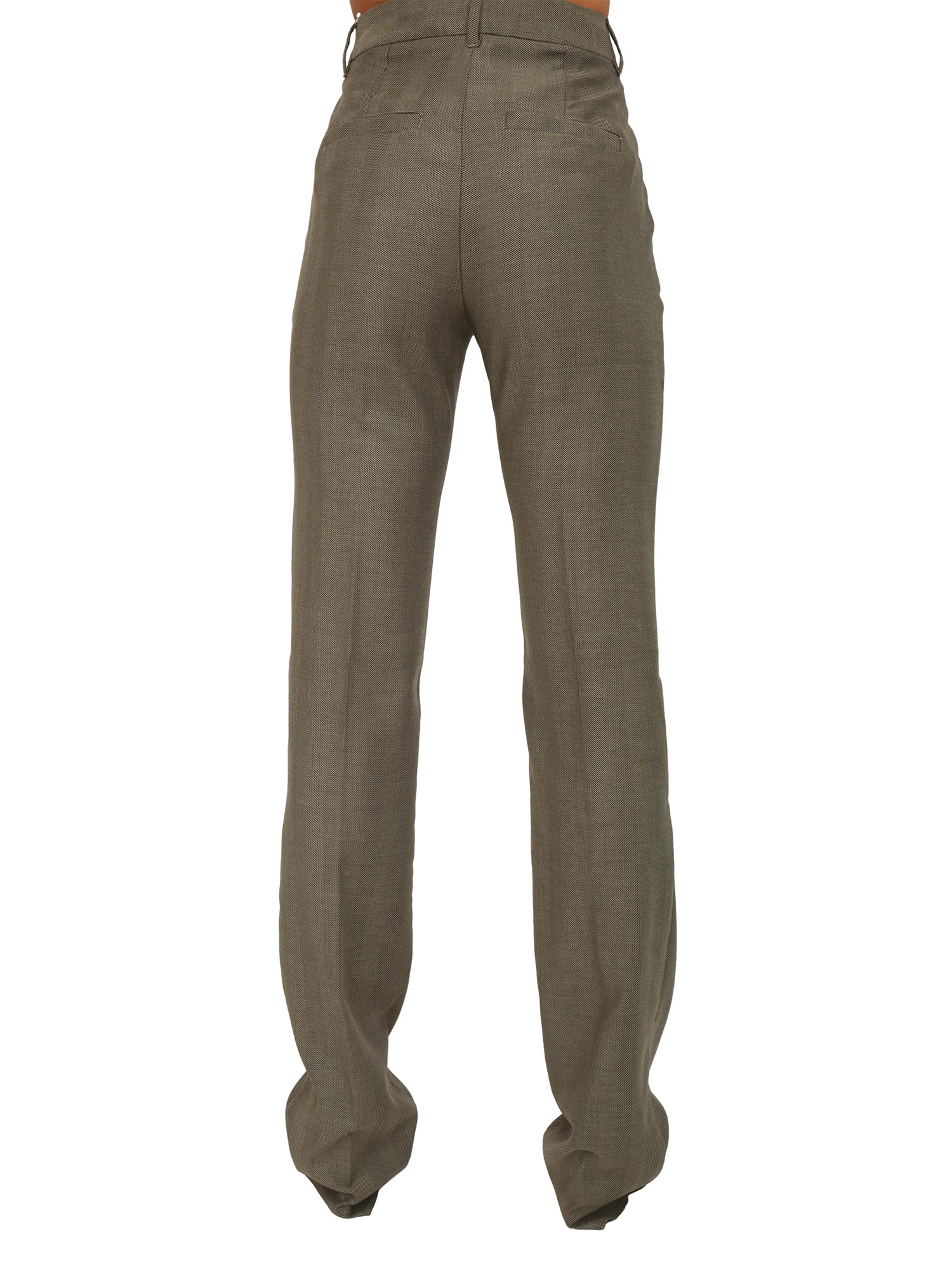Pantalone in saglia fluida di misto lana effetto resca, fit dritto, chiusura con gancio a uomo e zip nascosta, piega stirata fronte e retro e tasche laterali alla francese e posteriori a filetto. La modella è alta 1.72 e indossa la taglia 40.