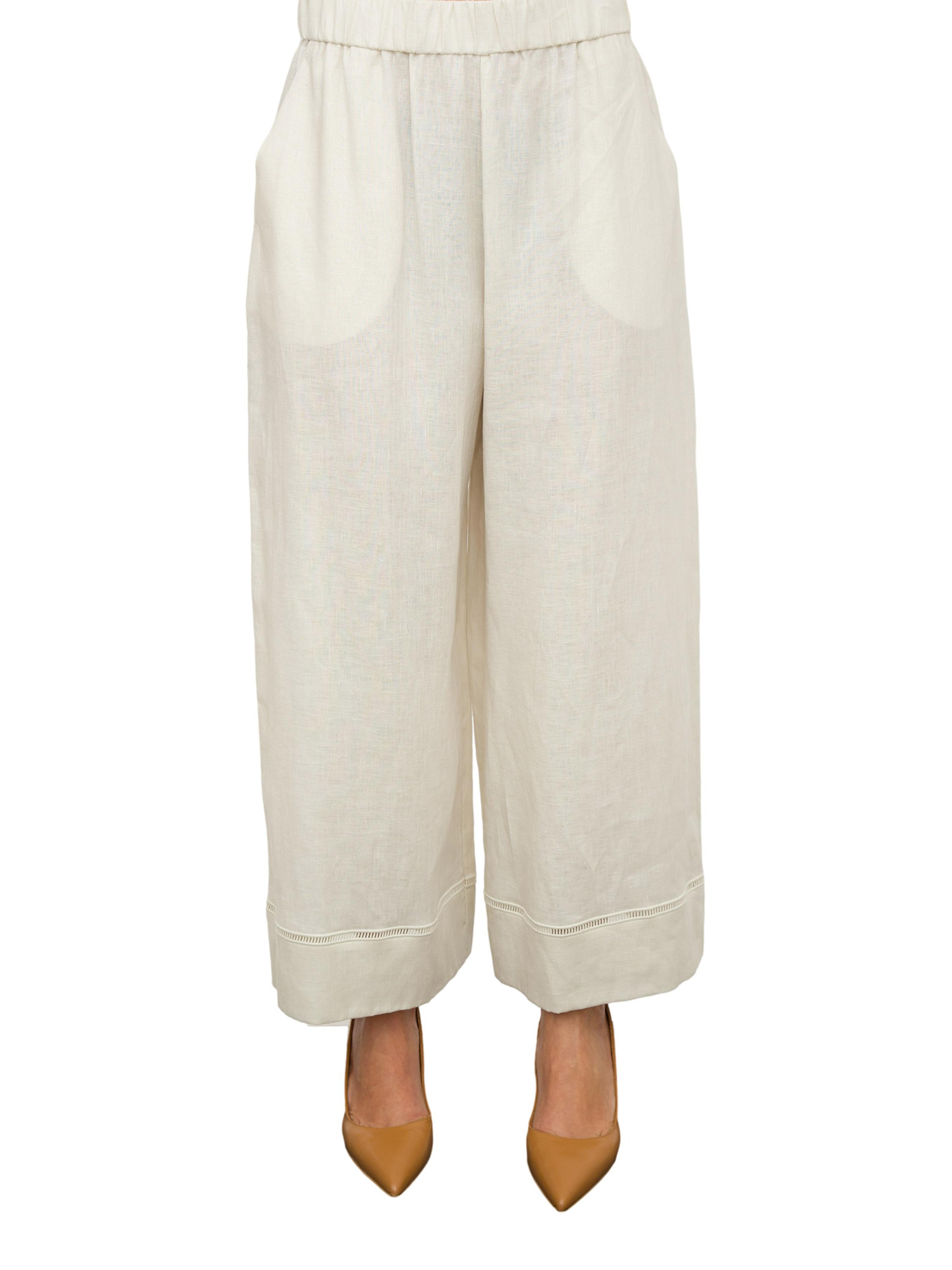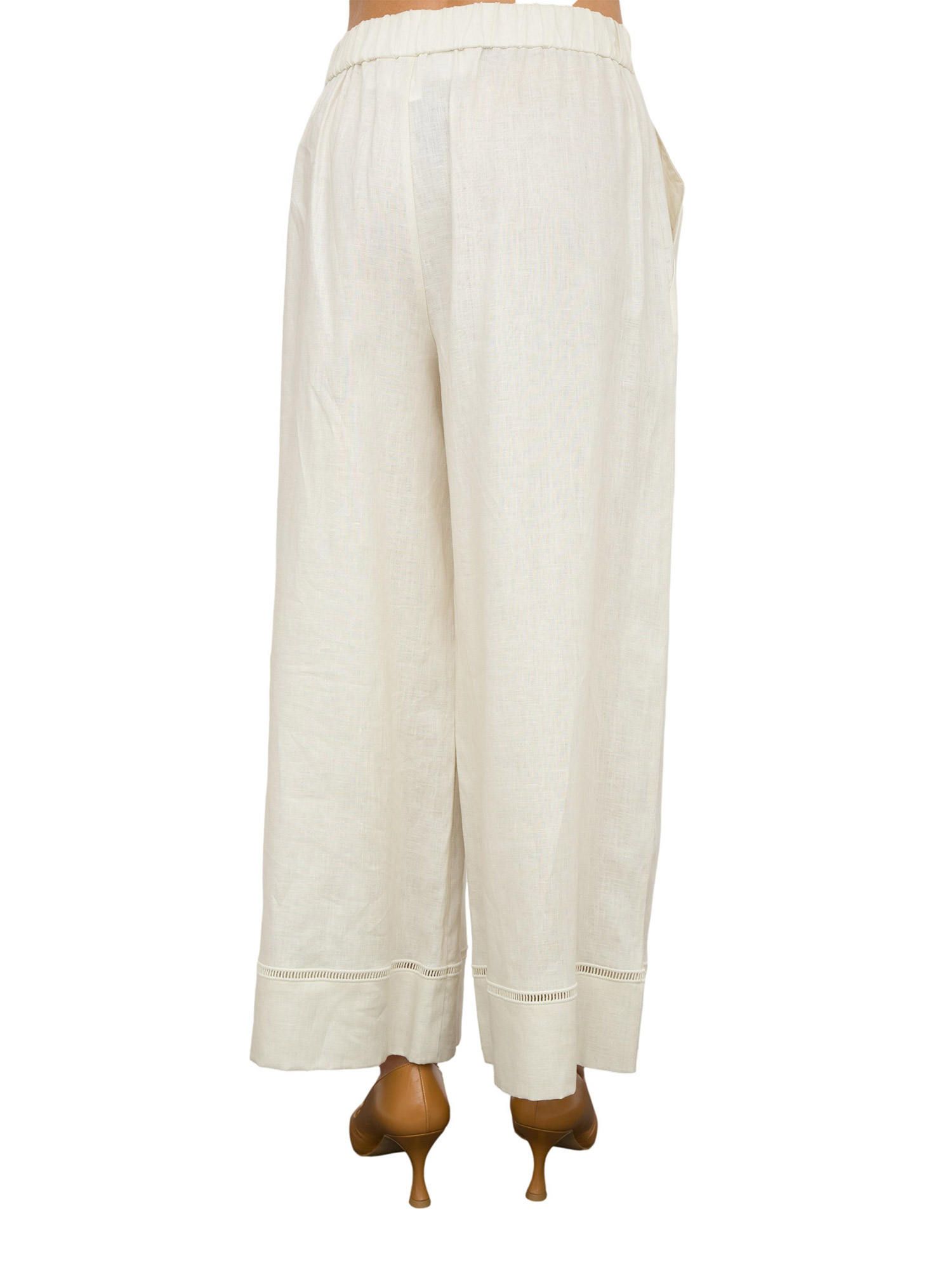Pantalone dalla linea dritta in tela leggera di puro lino, con vita elasticizzata e tasche sui fianchi.La modella è alta 1.72 e indossa la taglia 42.