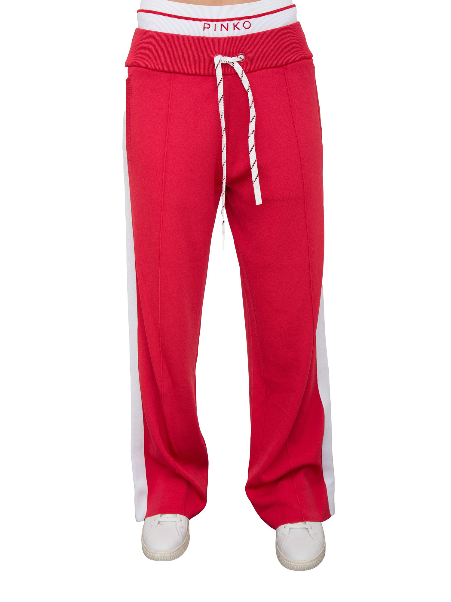 Pantaloni palazzo di ispirazione joggers realizzati in tessuto piquet tecnico di misto viscosa con lavorazione effetto felpa, che si caratterizzano per banda laterale a contrasto di colore. La silhouette con gamba dalla linea ampia è personalizzata da dettaglio in vita che ricrea l'effetto dell'underwear indossato sotto, con personalizzazione logo PINKO e coulisse a cordino da stringere. Le tasche a filetto verticale sui fianchi aggiungono ai pantaloni un mood ancora più rilassato.La modella è alta 1.72 e indossa la taglia XS.