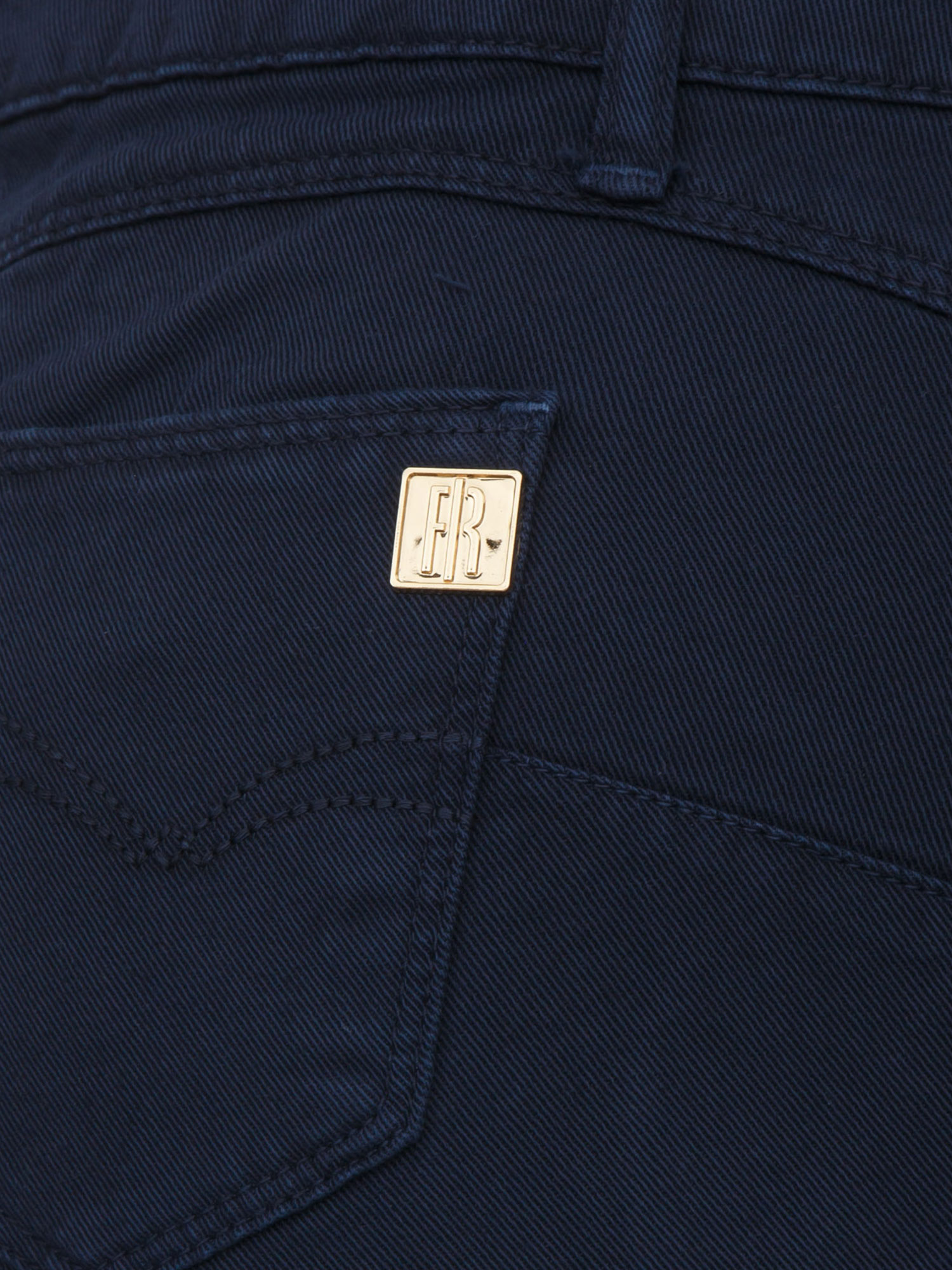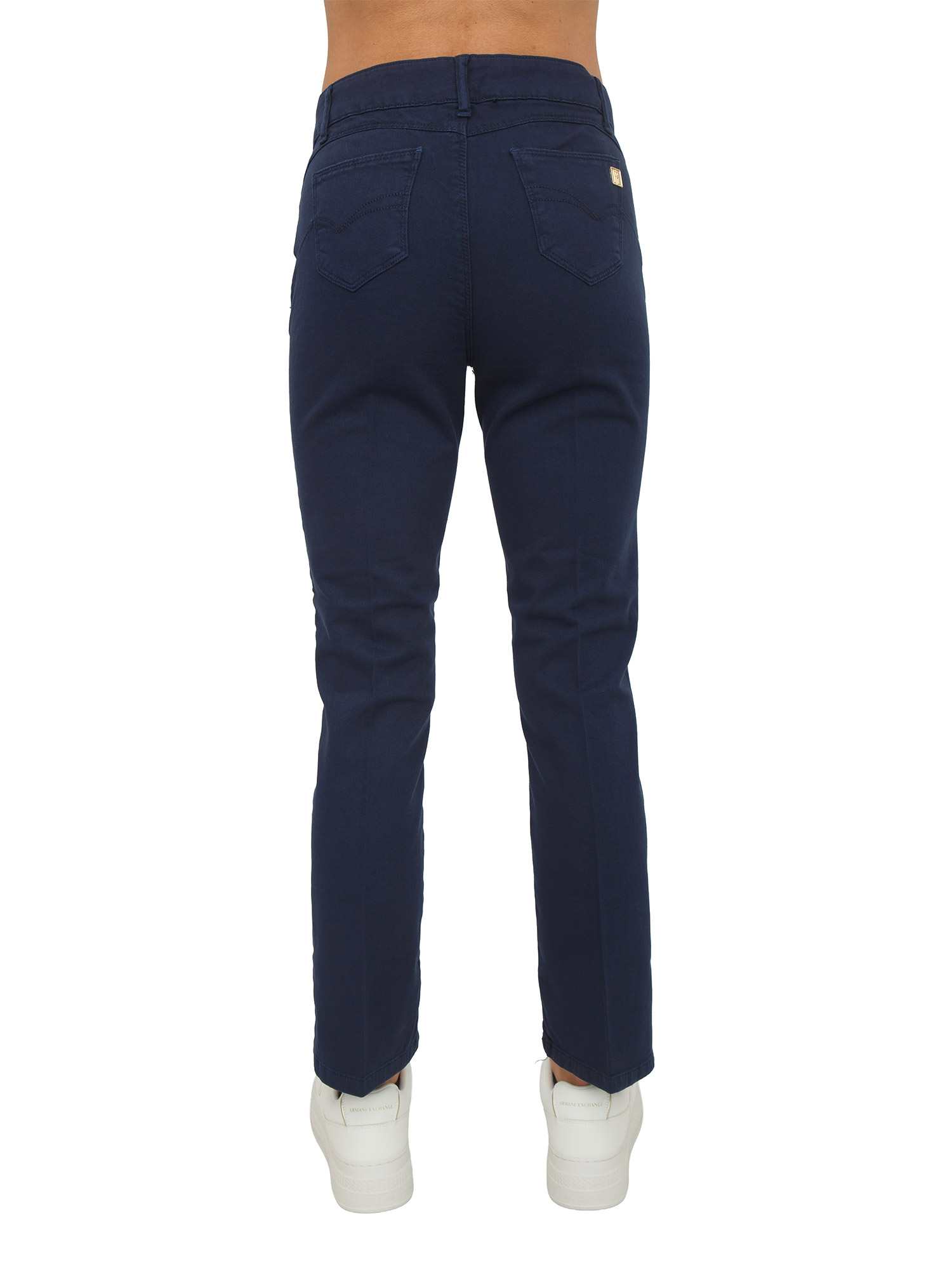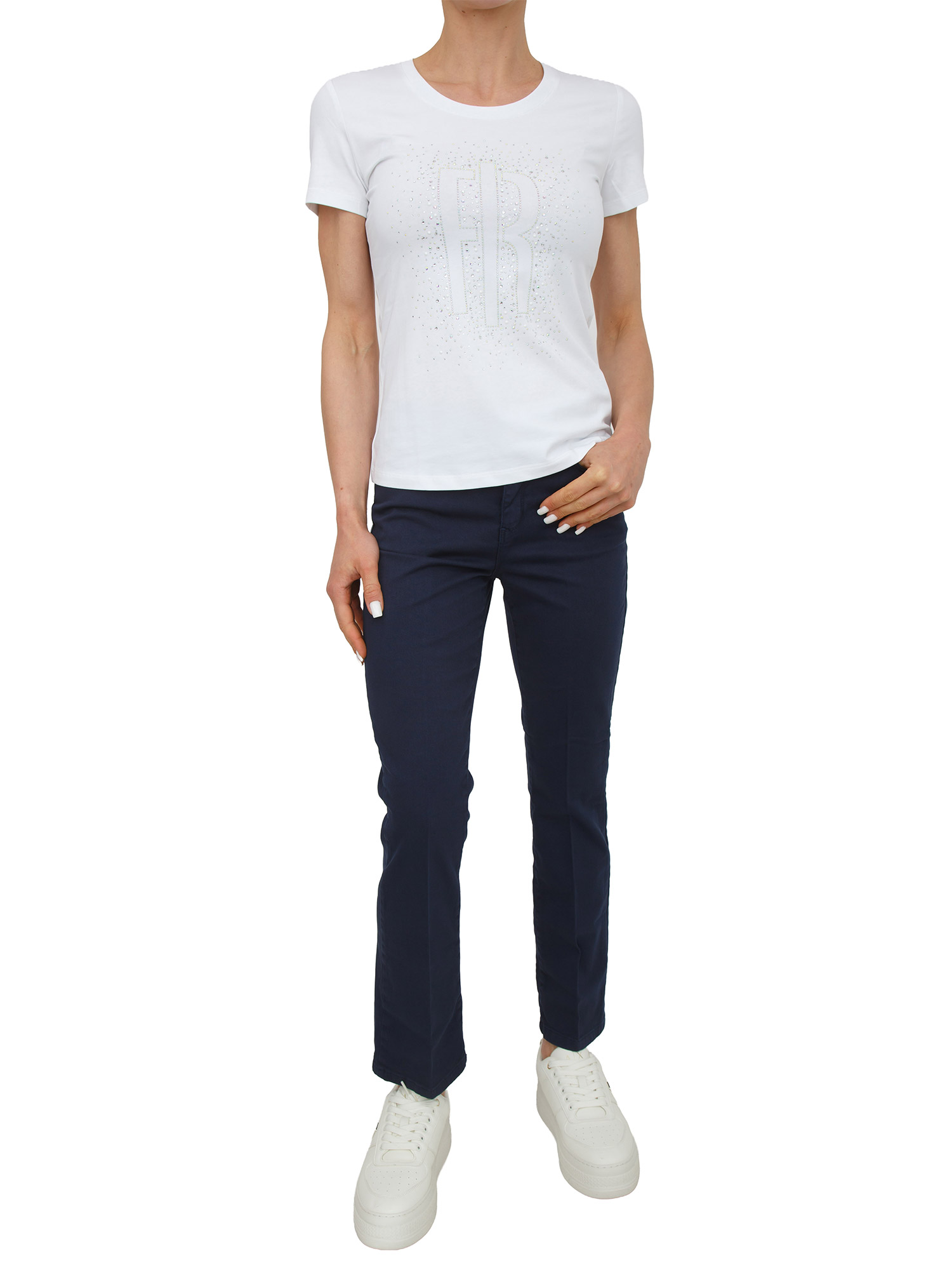 Pantalone cropped Fracomina realizzato in gabardina di cotone elasticizzato super comodo con effetto push up. Modello 5 tasche con vita regolare, piega stirata avanti e dietro e fondo leggermente flare. La modella è alta 1.72 e indossa la taglia 25.