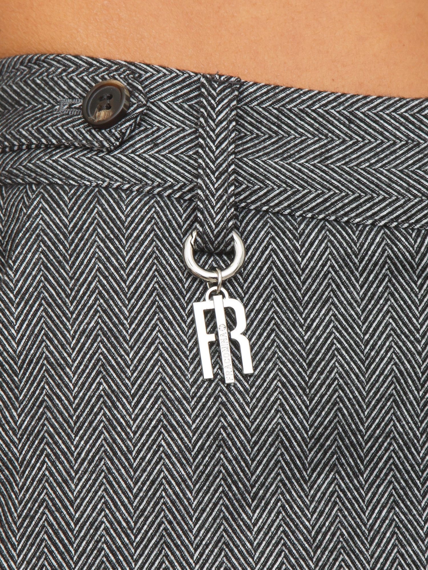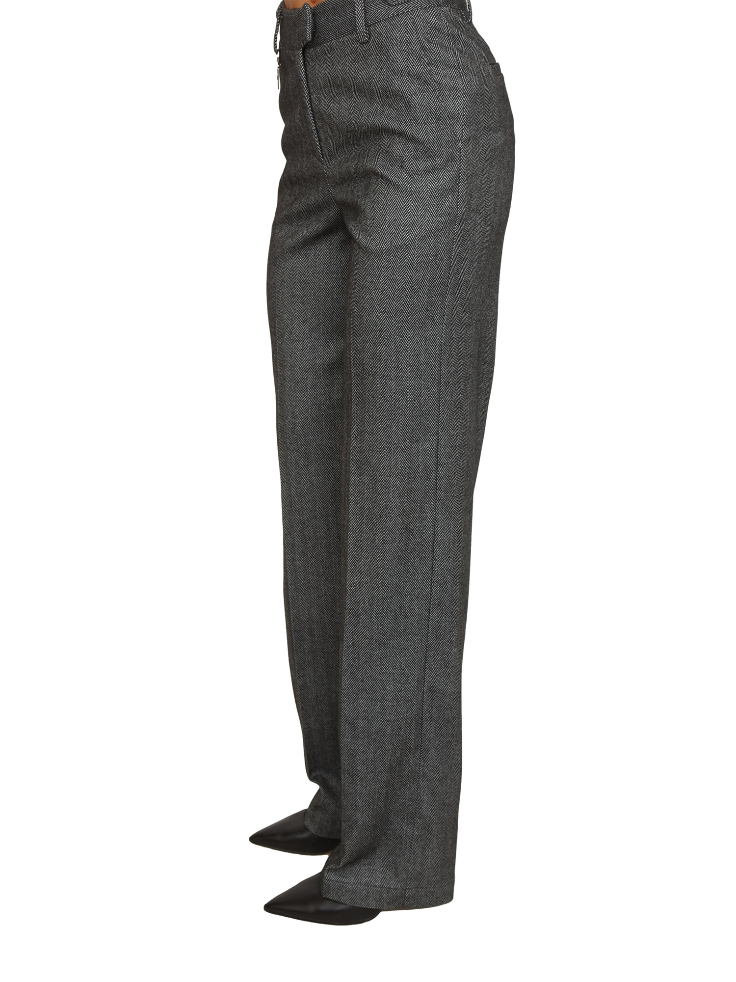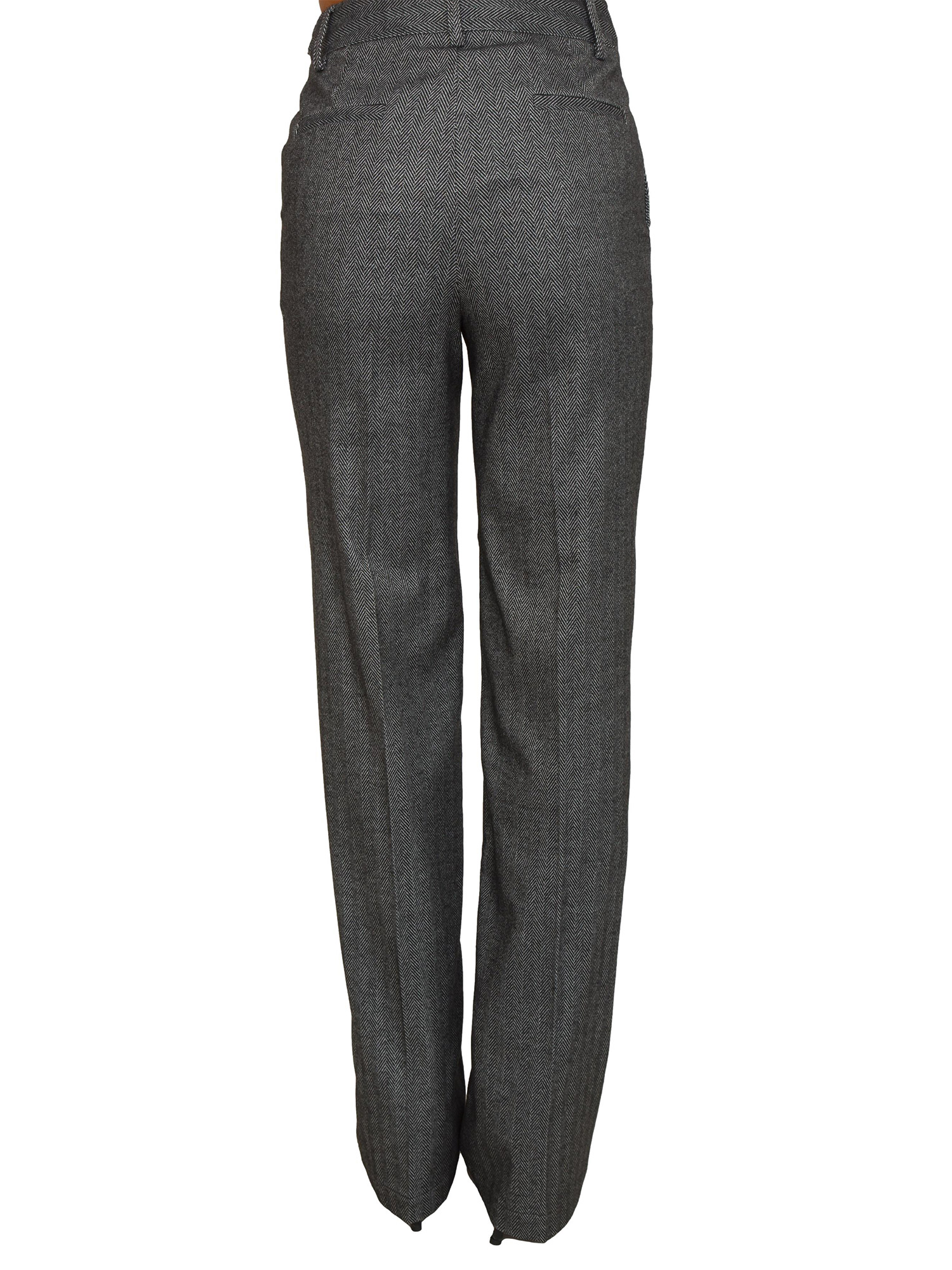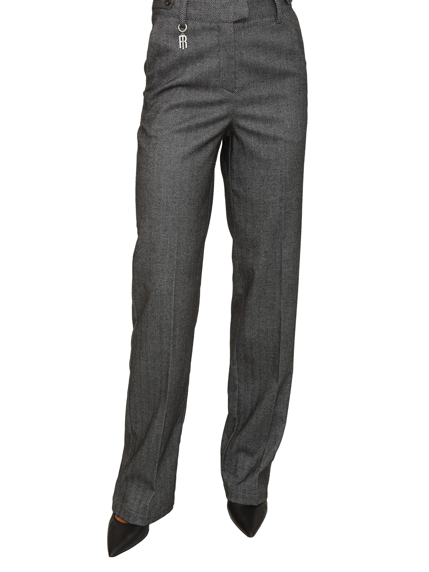 Pantalone donna Fracomina realizzato in tessuto spigato con vestibilità regular, vita alta e tasche laterali. Design caratterizzato da gamba dritta con piega stirata avanti e dietro e chiusura zip nascosta. La modella è alta 1.72 e indossa la taglia 38.