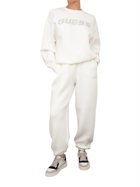 Pantaloni jogger Guess Jeans donna con vestibilità regular, vita media con fascia elastica e fondo gamba con coulisse. Modello con logo davanti ideale da indossare in tutti i tuoi outfit sportivi. La modella è alta 1.72 e indossa la taglia S.