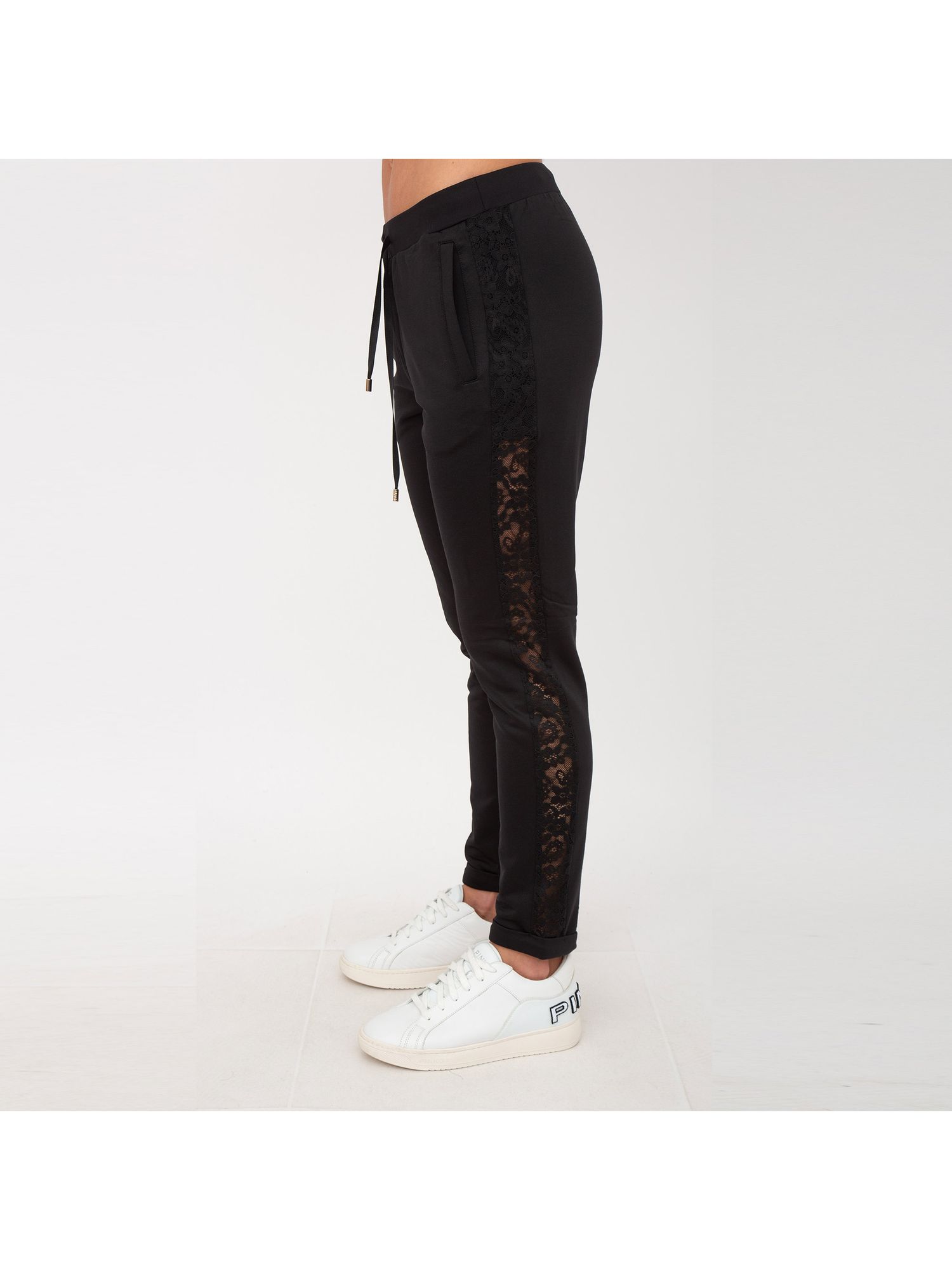 Pantaloni jogging in felpa di misto cotone stretch, dettaglio in pizzo sui lati, cintone elastico con coulisse in vita, tasche sui fianchi e risvolto al fondo.