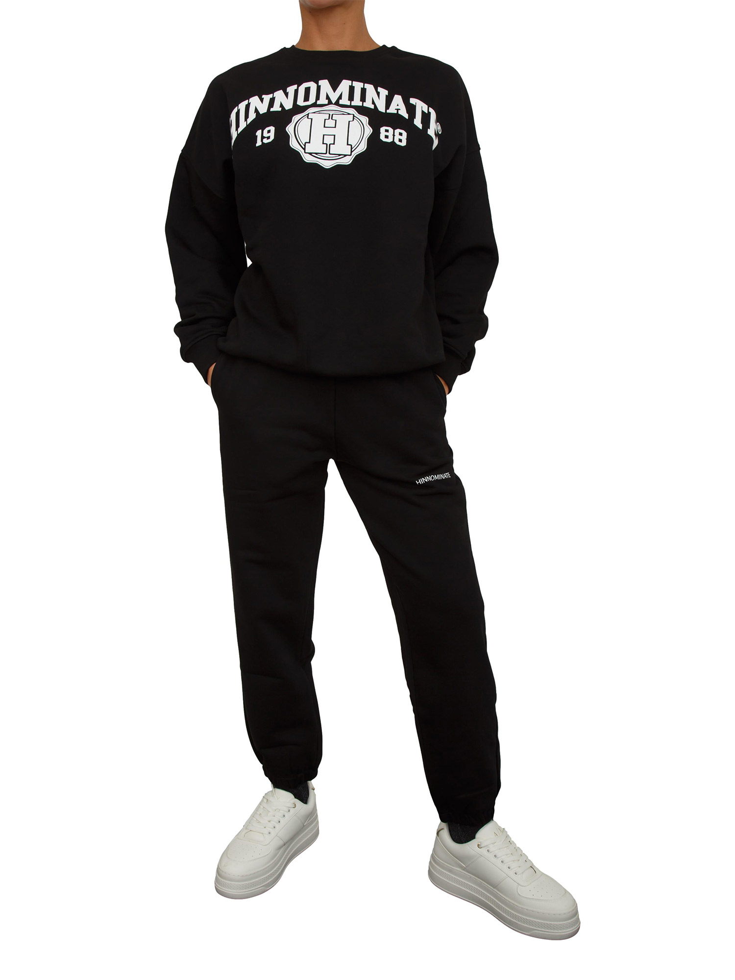 Pantalone tuta Hinnominate donna realizzato in cotone con vestibilità regular e logo a contrasto. Design con elastico in vita, coulisse in fondo e tasche laterali. La modella è alta 1.72 e indossa la taglia S.