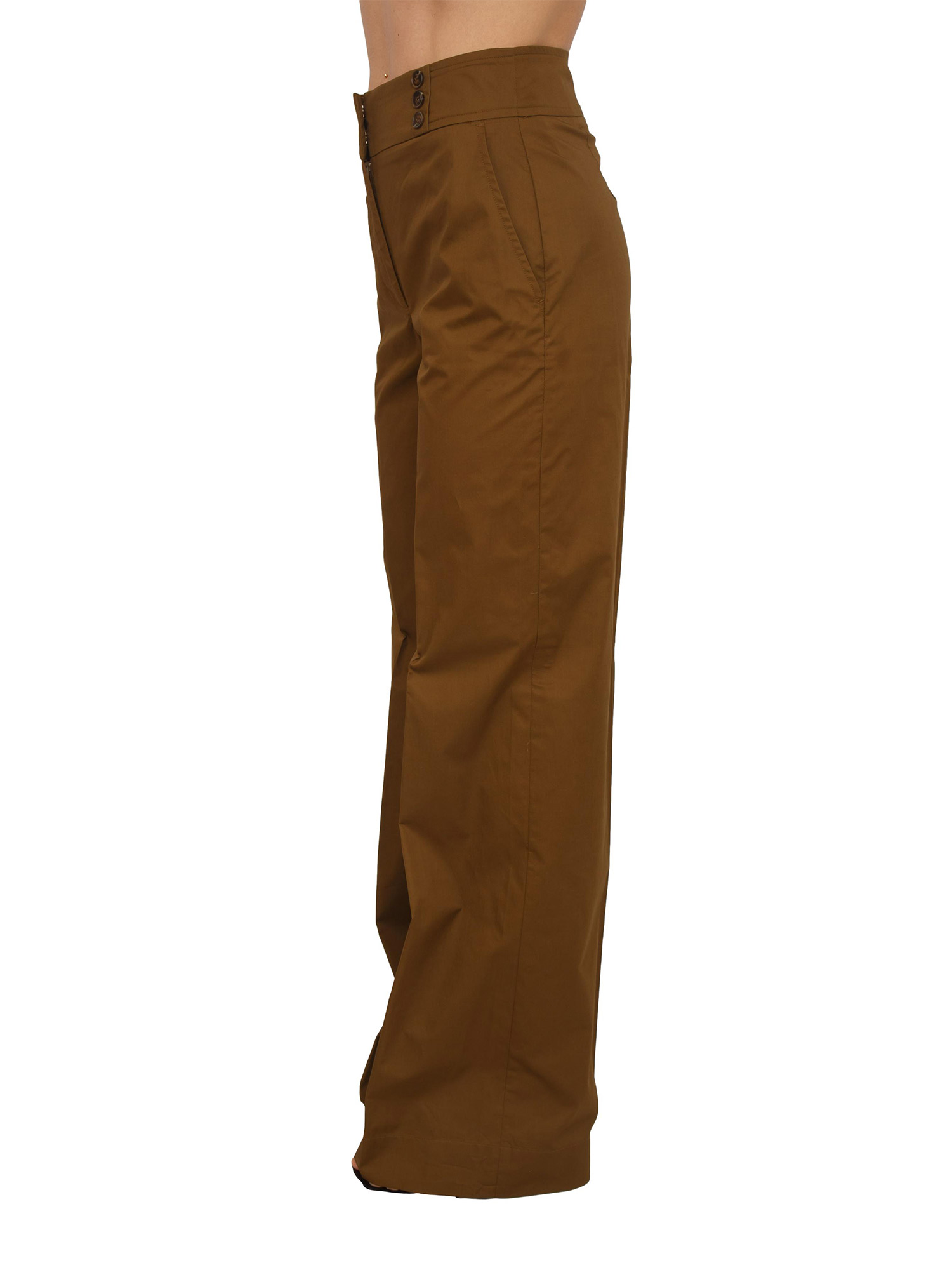 Raffinato pantalone Emon Nenette a gamba larga dalla linea pulita e contemporanea. Vita alta definita da un cinturino sagomato impreziosito lateralmente da bottoni che richiamano uno stile marinaro chic e stiratura centrale che slancia la figura. La modella è alta 1.72 e indossa la taglia 38.