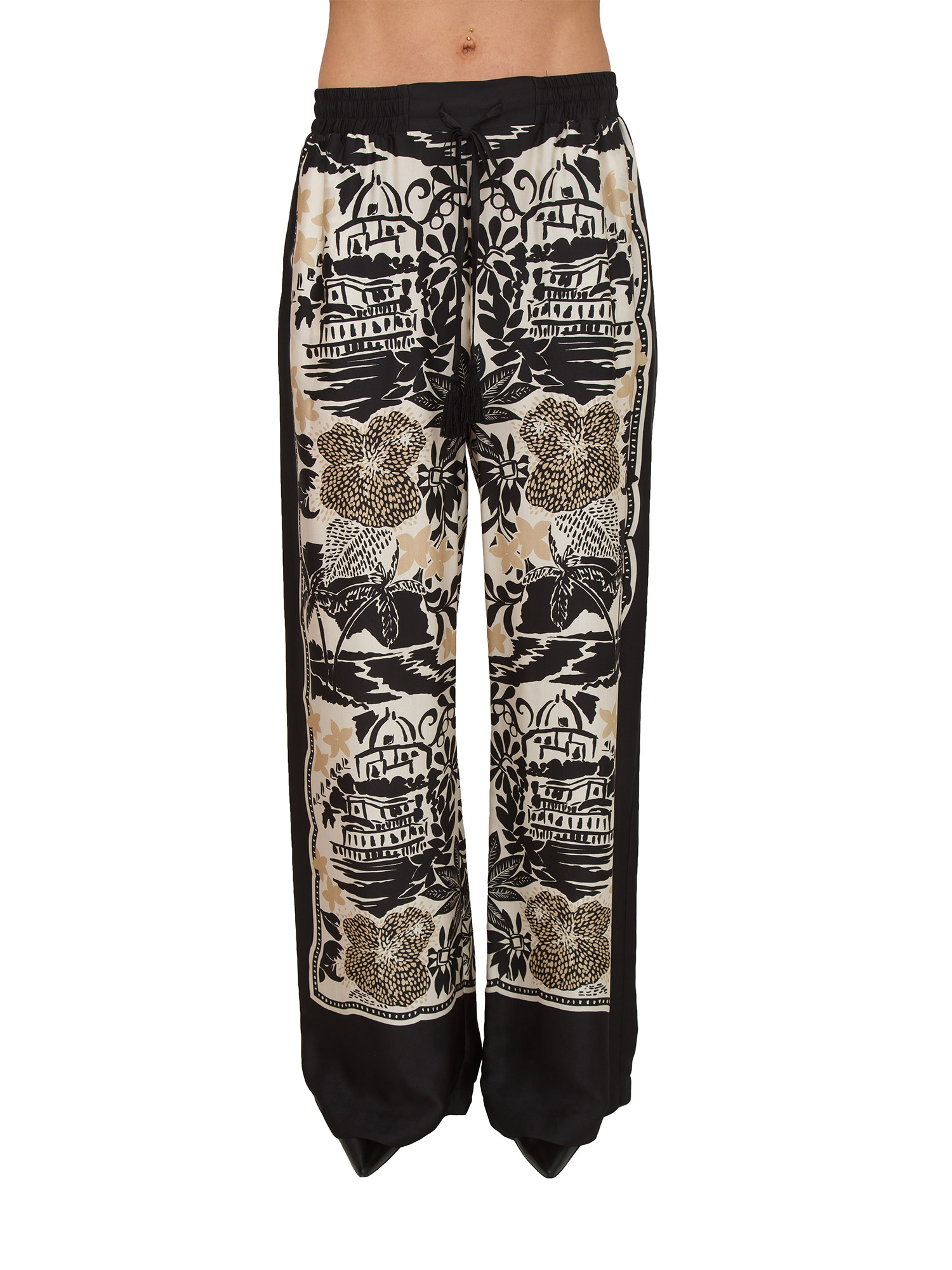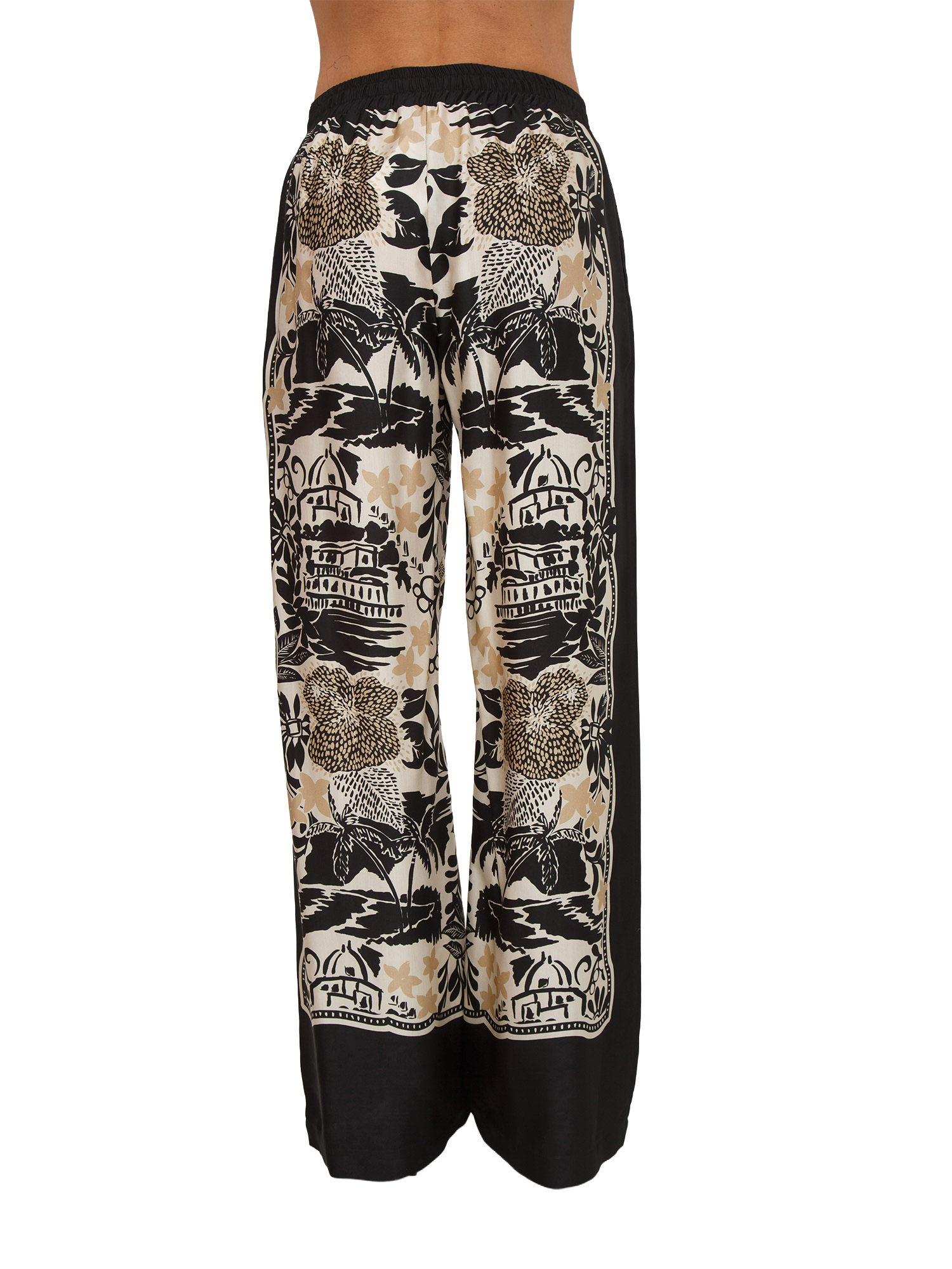 Pantaloni Ermanno Firenze realizzati in raso di viscosa con stampa tropicale. Vestibilità morbida con elastico in vita, comodissima coulisse con nappine e tasche nei fianchi. La modella è alta 1.72 e indossa la taglia 40.