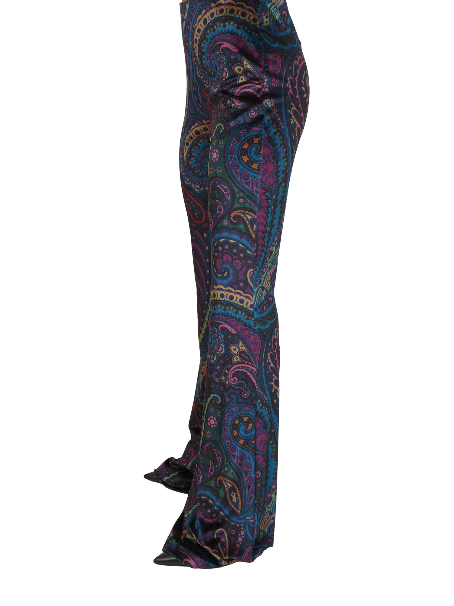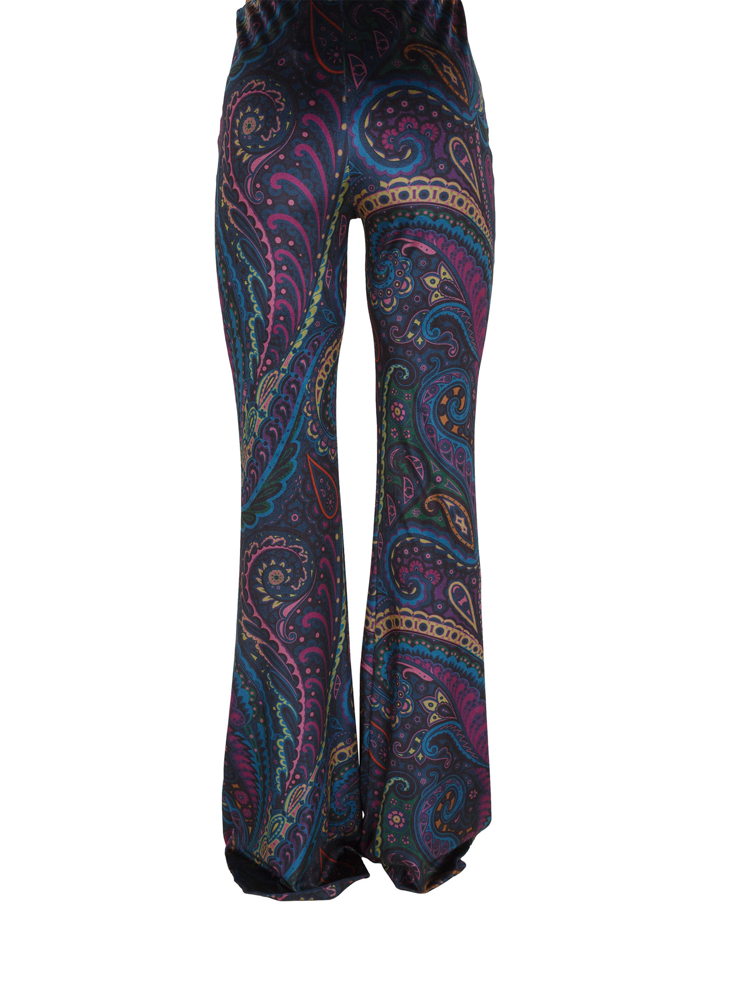 Pantaloni flare Etro donna dalla linea aderente sui fianchi con svasatura al fondo. Il modello è realizzato in ciniglia stretch e decorato da una stampa Paisley multicolore all over. Stupendo da indossare con la sua maglia. La modella è alta 1.72 e indossa la taglia S.