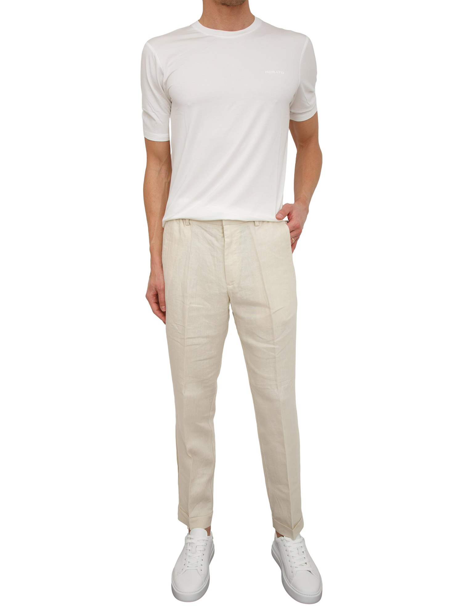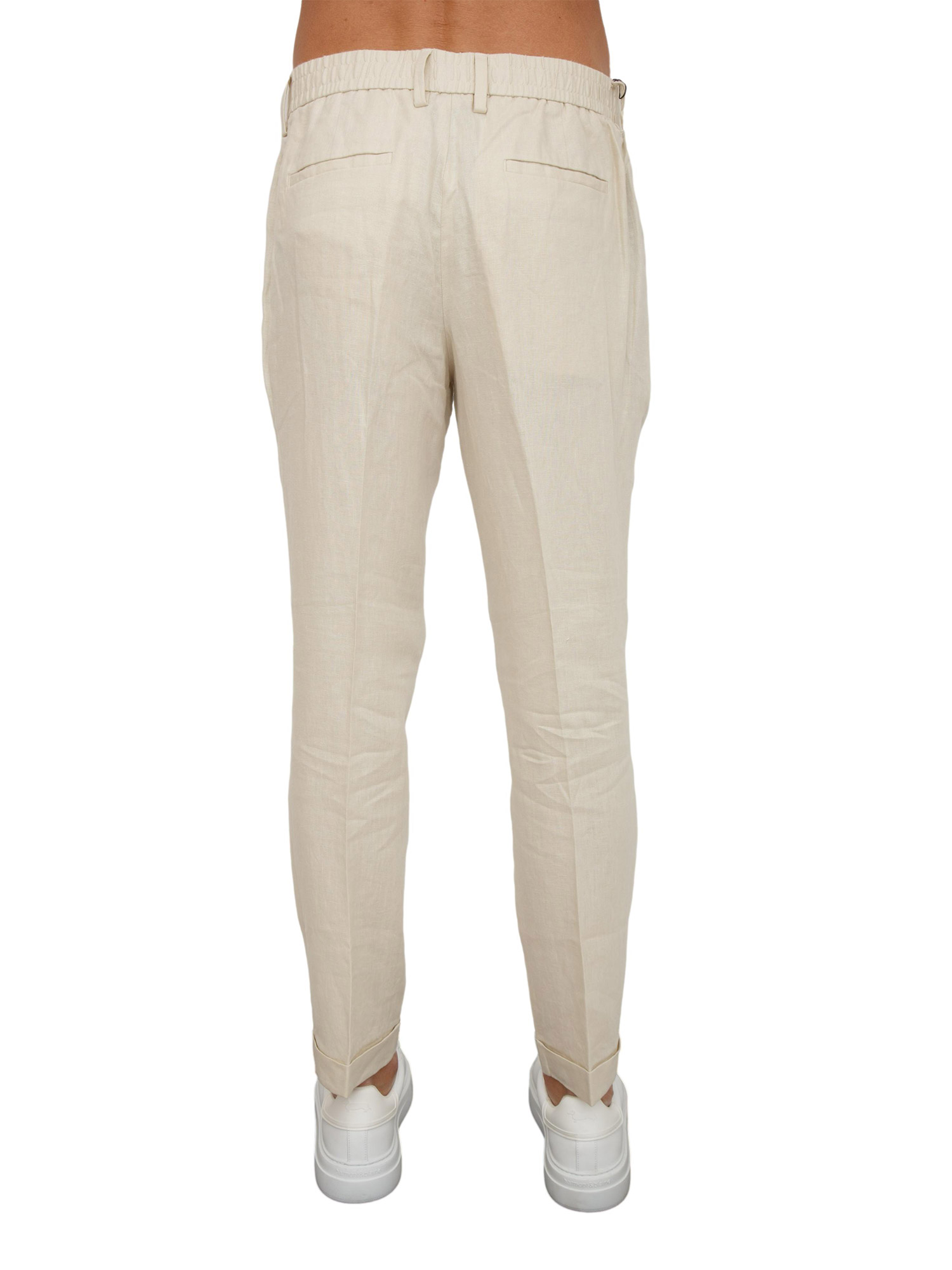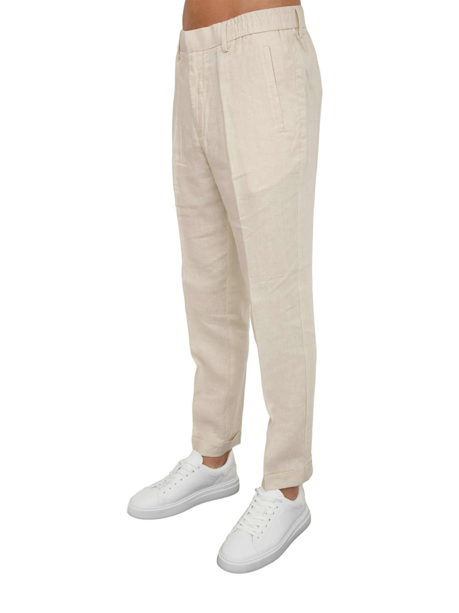 Pantaloni Liu Jo uomo realizzati in puro lino con cintone elastico in vita e comode tasche. Vestibilità slim fit, risvolto sul fondo, tasche chino laterali e tasche a filetto dietro. Ideali da portare tutta l'estate. Il modello è alto 1.90m e indossa la taglia 48.