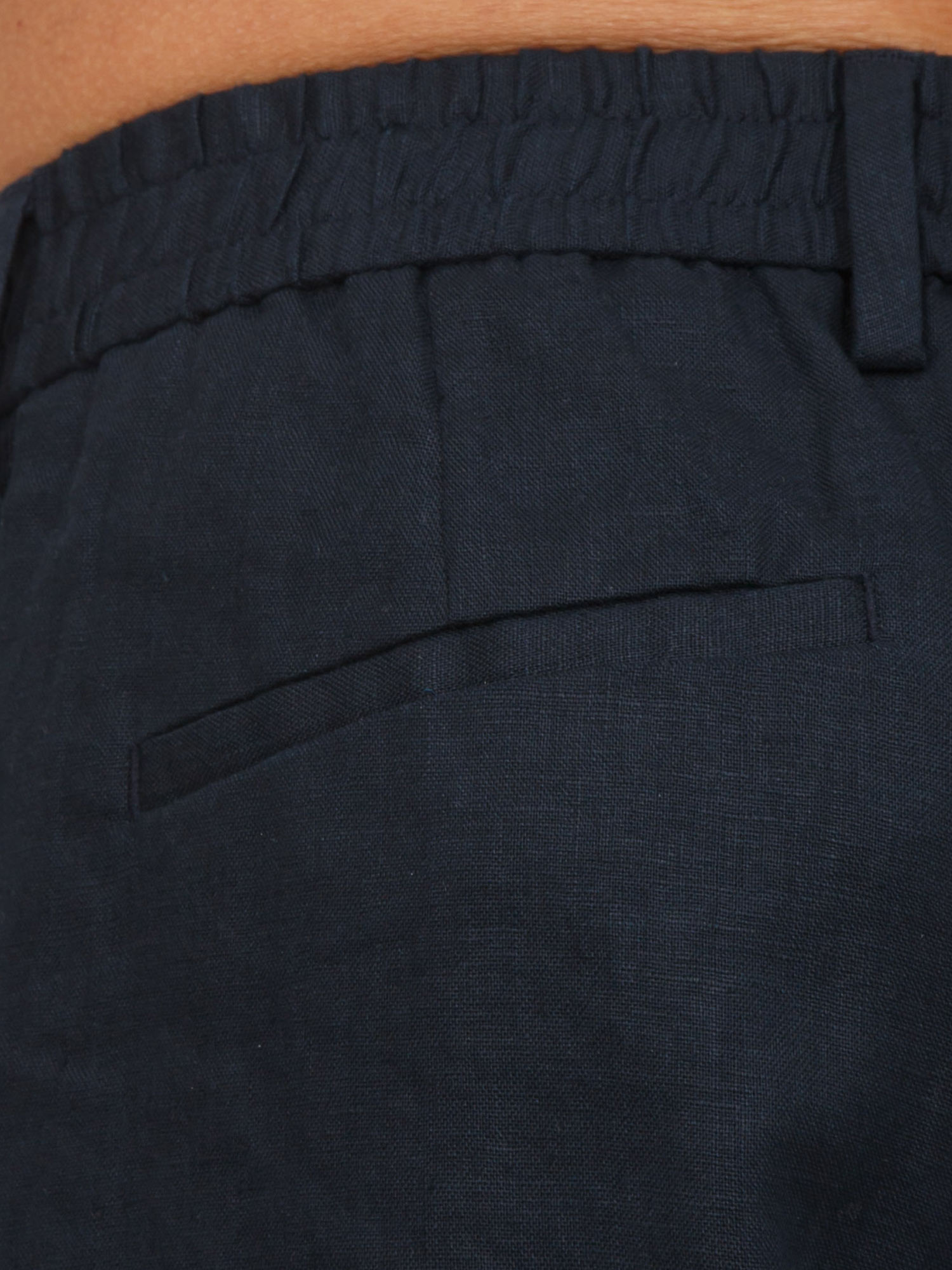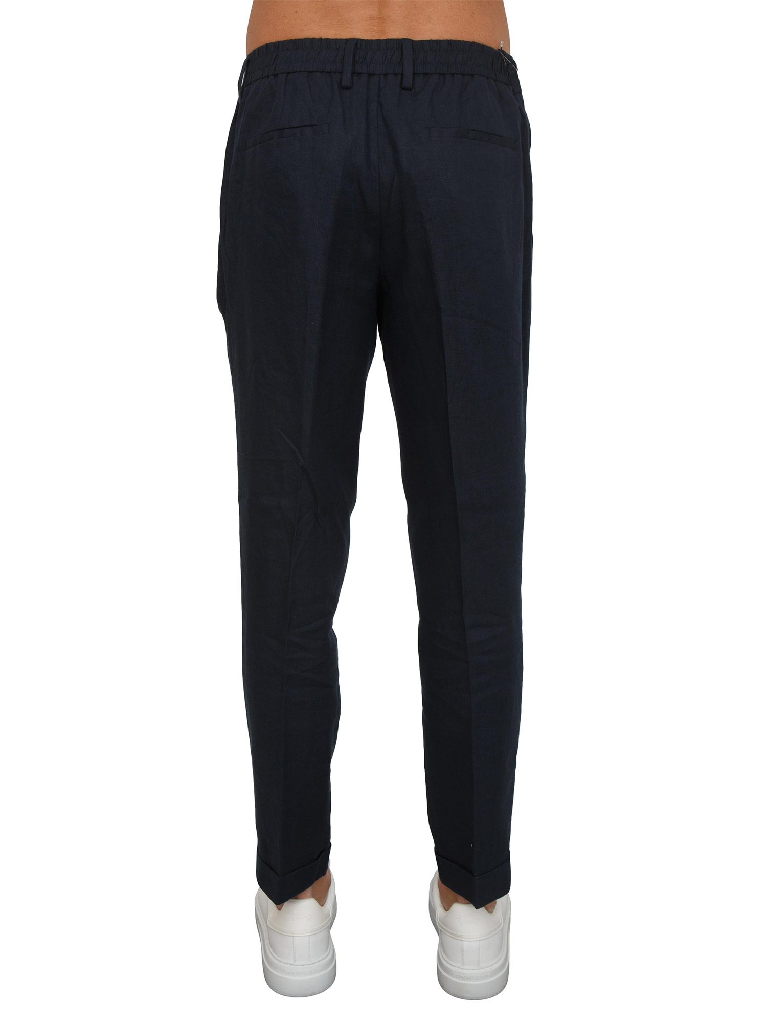 Pantaloni Liu Jo uomo realizzati in puro lino con cintone elastico in vita e comode tasche. Vestibilità slim fit, risvolto sul fondo, tasche chino laterali e tasche a filetto dietro. Ideali da portare tutta l'estate. Il modello è alto 1.90m e indossa la taglia 48.