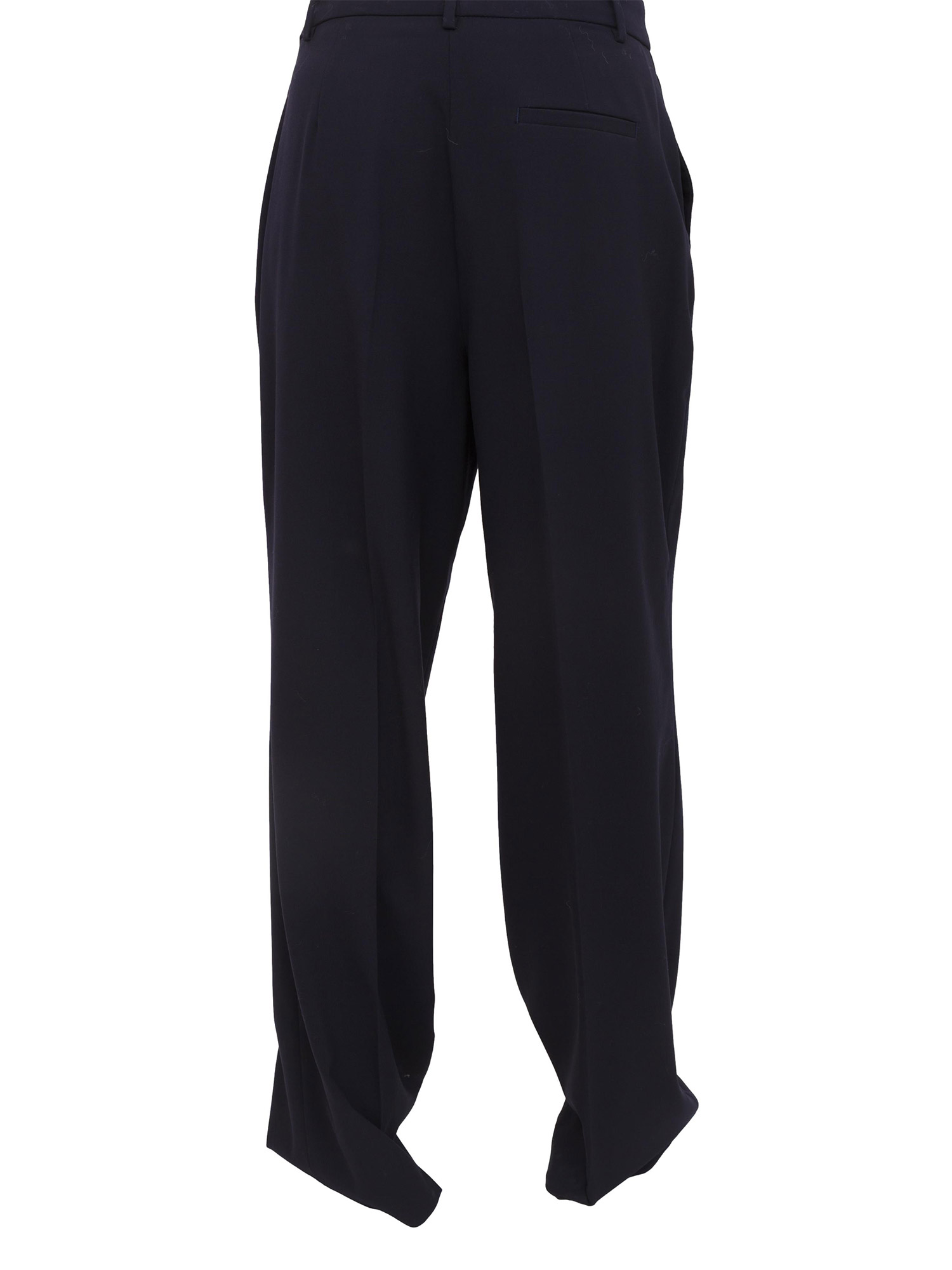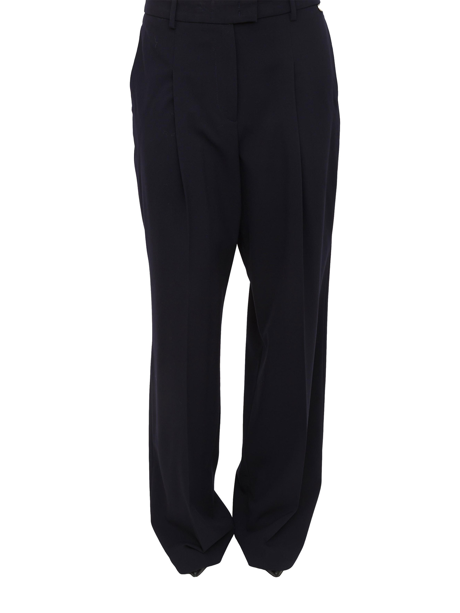 Pantaloni Liu Jo donna realizzati in in misto viscosa stretch con pinces e piega stirata. Modello a palazzo con tasche sui fianchi, chiusura zip coperta e tasca a filetto dietro. La modella è alta 1.72 e indossa la taglia 40.