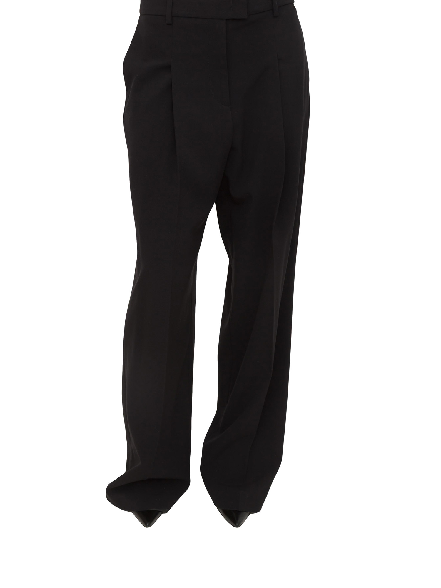 Pantaloni Liu Jo donna realizzati in in misto viscosa stretch con pinces e piega stirata. Modello a palazzo con tasche sui fianchi, chiusura zip coperta e tasca a filetto dietro. La modella è alta 1.72 e indossa la taglia 40.
