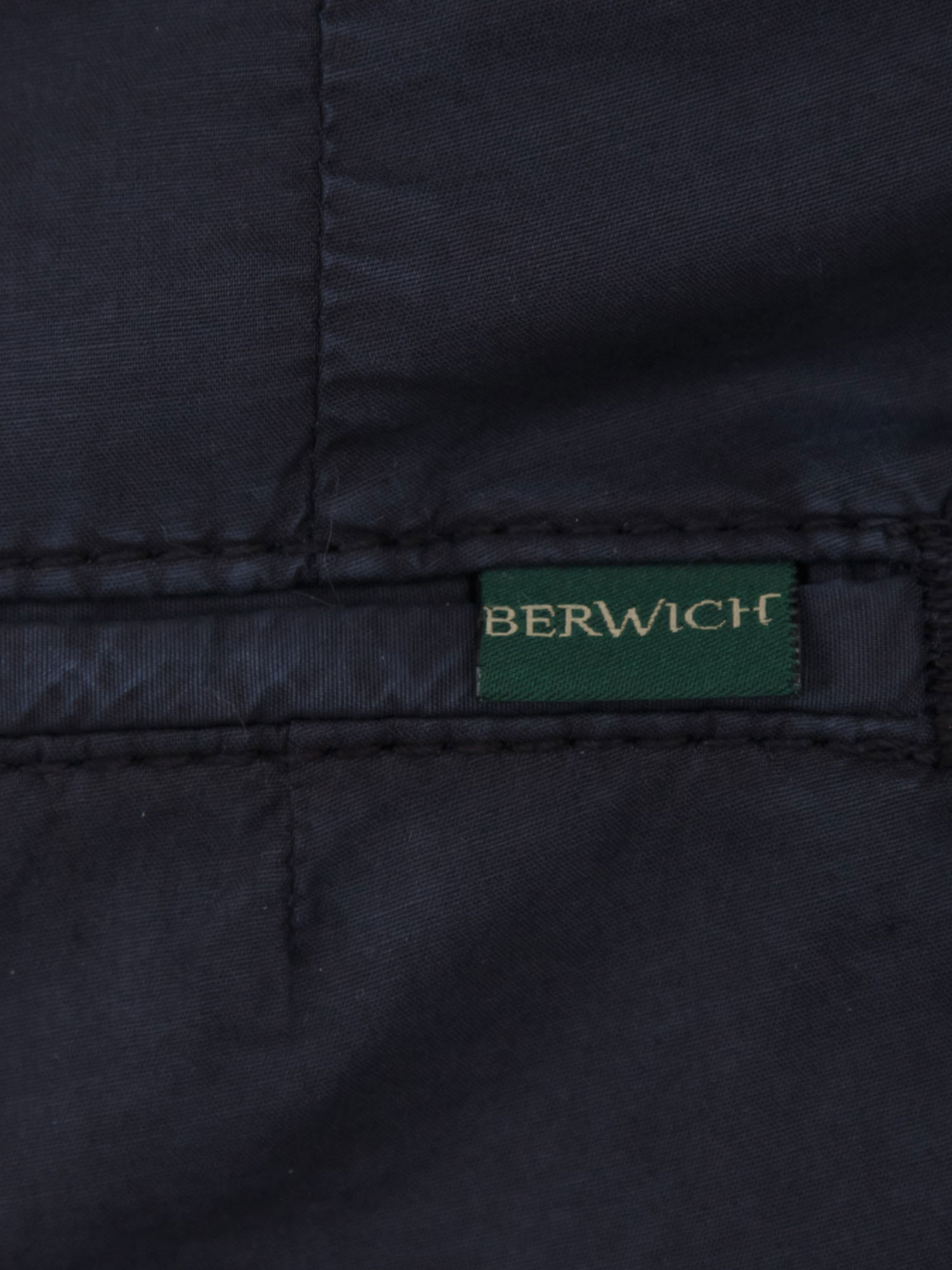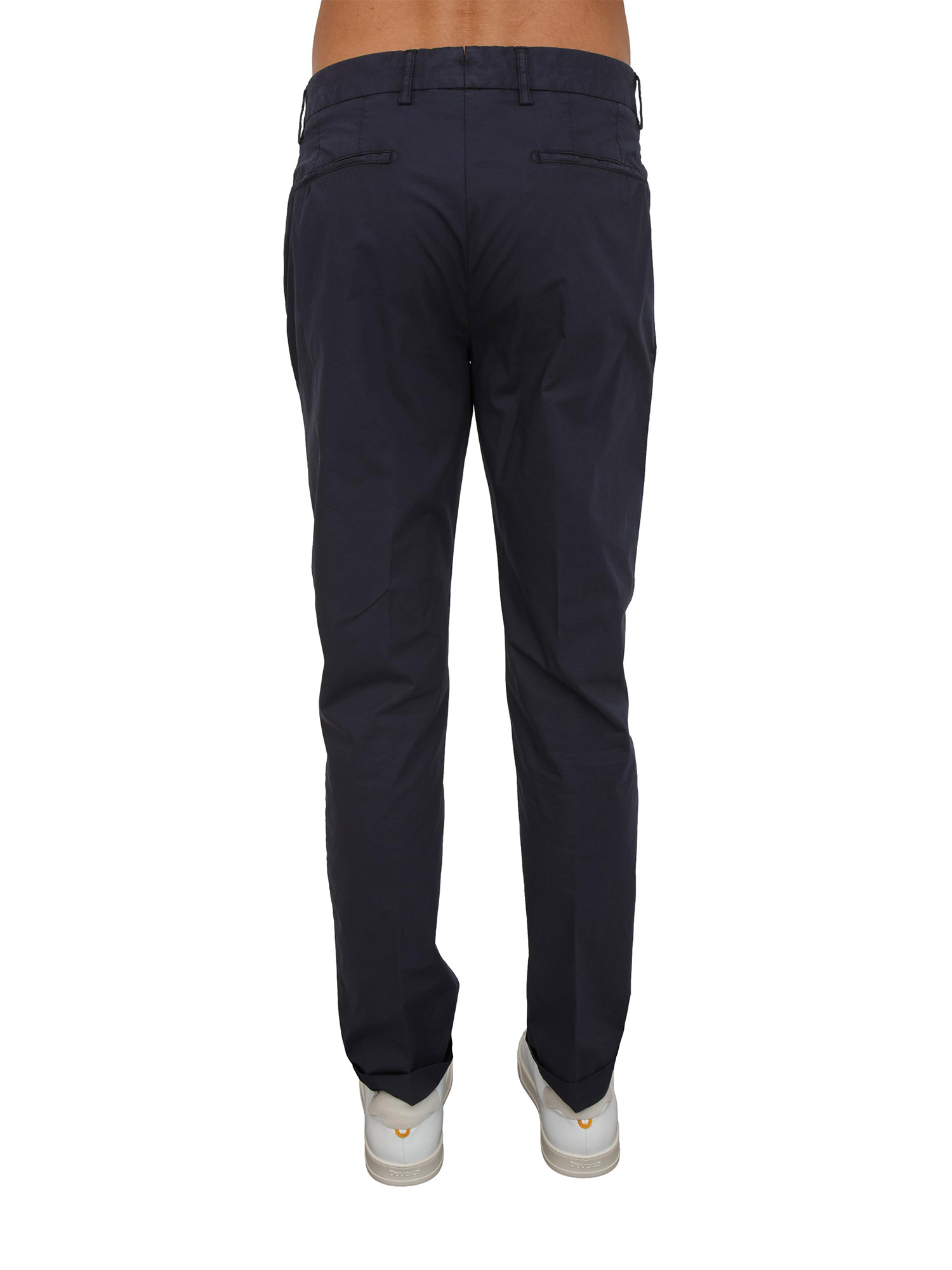 Pantaloni uomo Berwich realizzati in fresco cotone e lyocell elasticizzati. Dotati di tasche a filetto laterali, sul retro e risvolto sul fondo. Modello arricchito da pince sul davanti e chiusura con bottone e zip nascosta. Il modello è alto 1.90m e indossa la taglia 48.