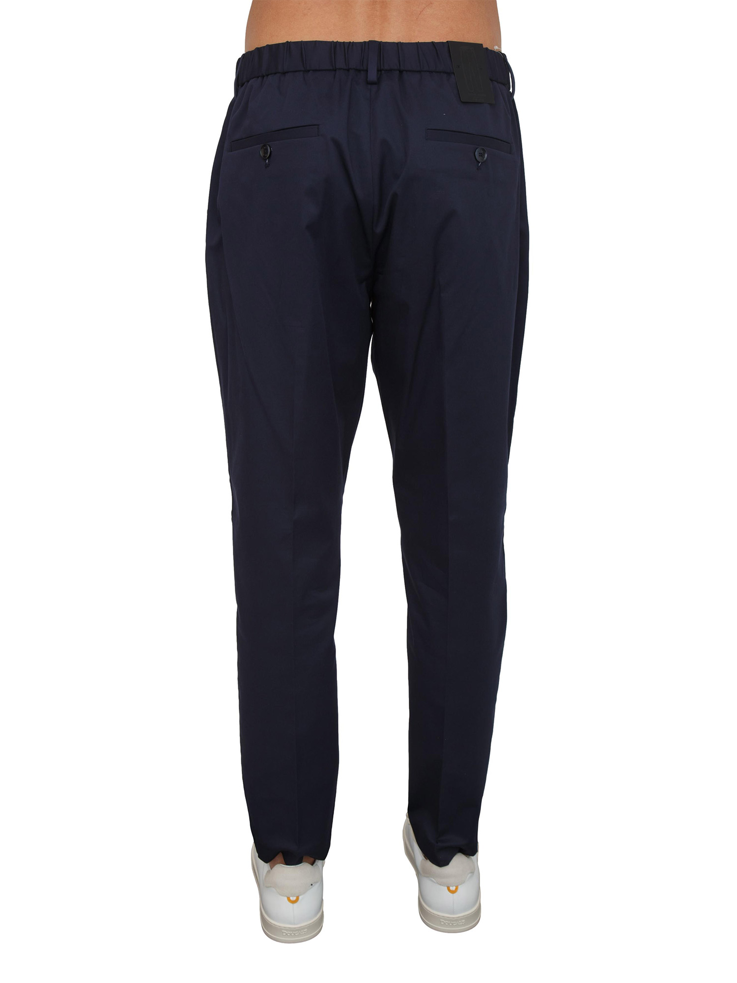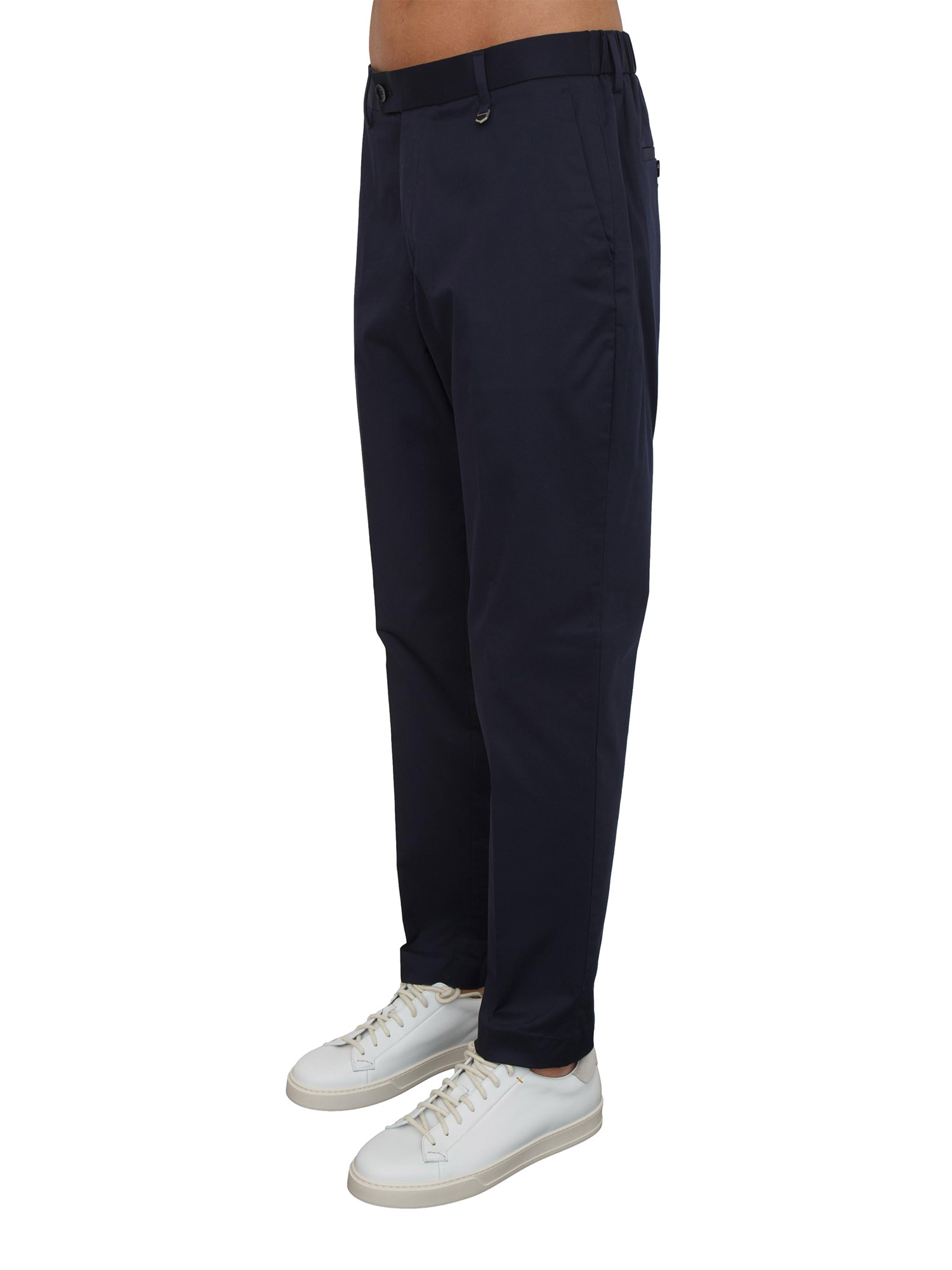Pantaloni uomo "Julian" di Antony Morato realizzati in twill di cotone e lyocell con vestibilità regular. Design dotato di tasche laterali, tasche a filetto sul retro con elastico in vita dietro e piega stirata. Il modello è alto 1.90m e indossa la taglia 48.