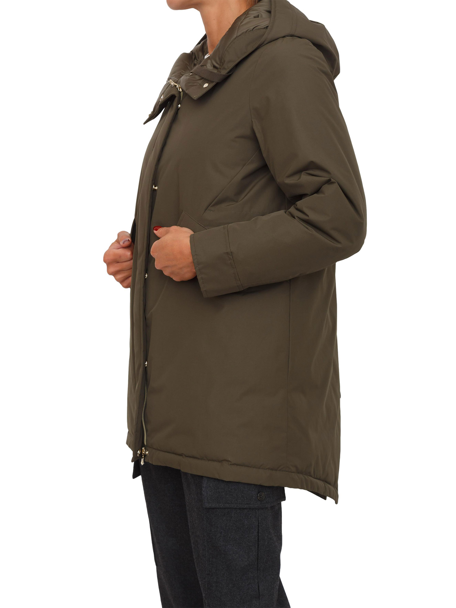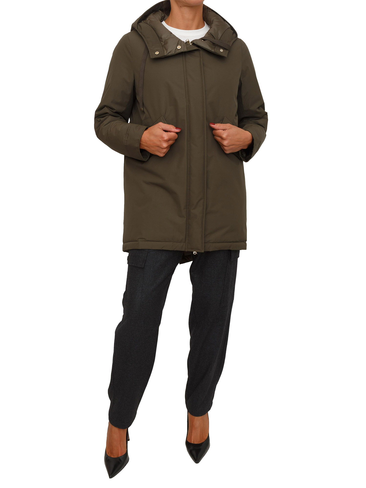 Parka Emme Marella in taffetà tecnico leggero e lucente, con linea svasata modulabile internamente con coulisse per mettere in evidenza il punto vita. Perfetto per attraversare la città con passo deciso, anche nei giorni di pioggia. La modella è alta 1.72 e indossa la taglia 38.