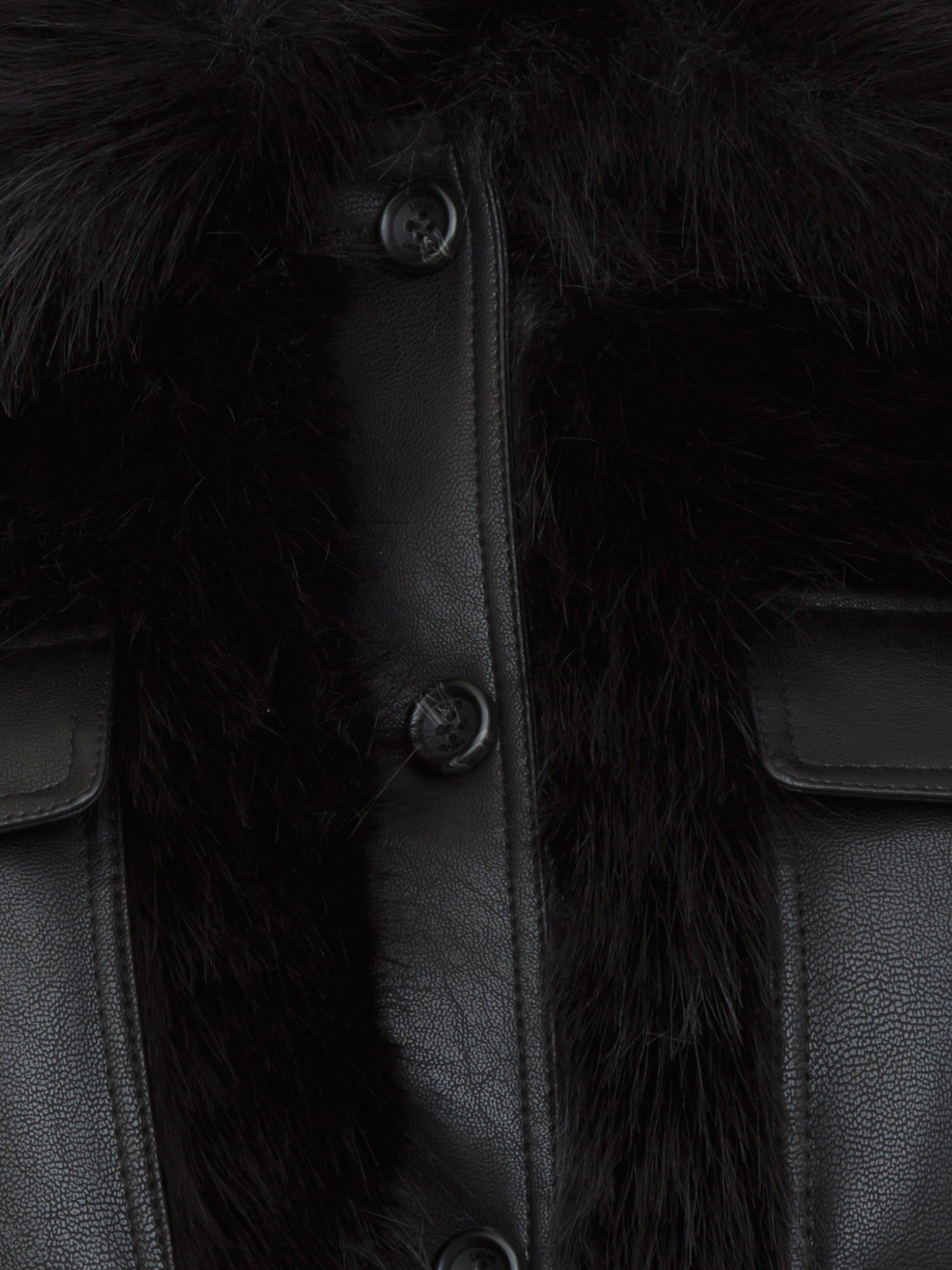 Pelliccia Liu Jo donna modello bomber con collo a revers e chiusura con inserto in ecopelle e bottoni. Design arricchito con tasche in ecopelle con patta sul davanti e bordi a costine in ecopelle. La modella è alta 1.72 e indossa la taglia 40.