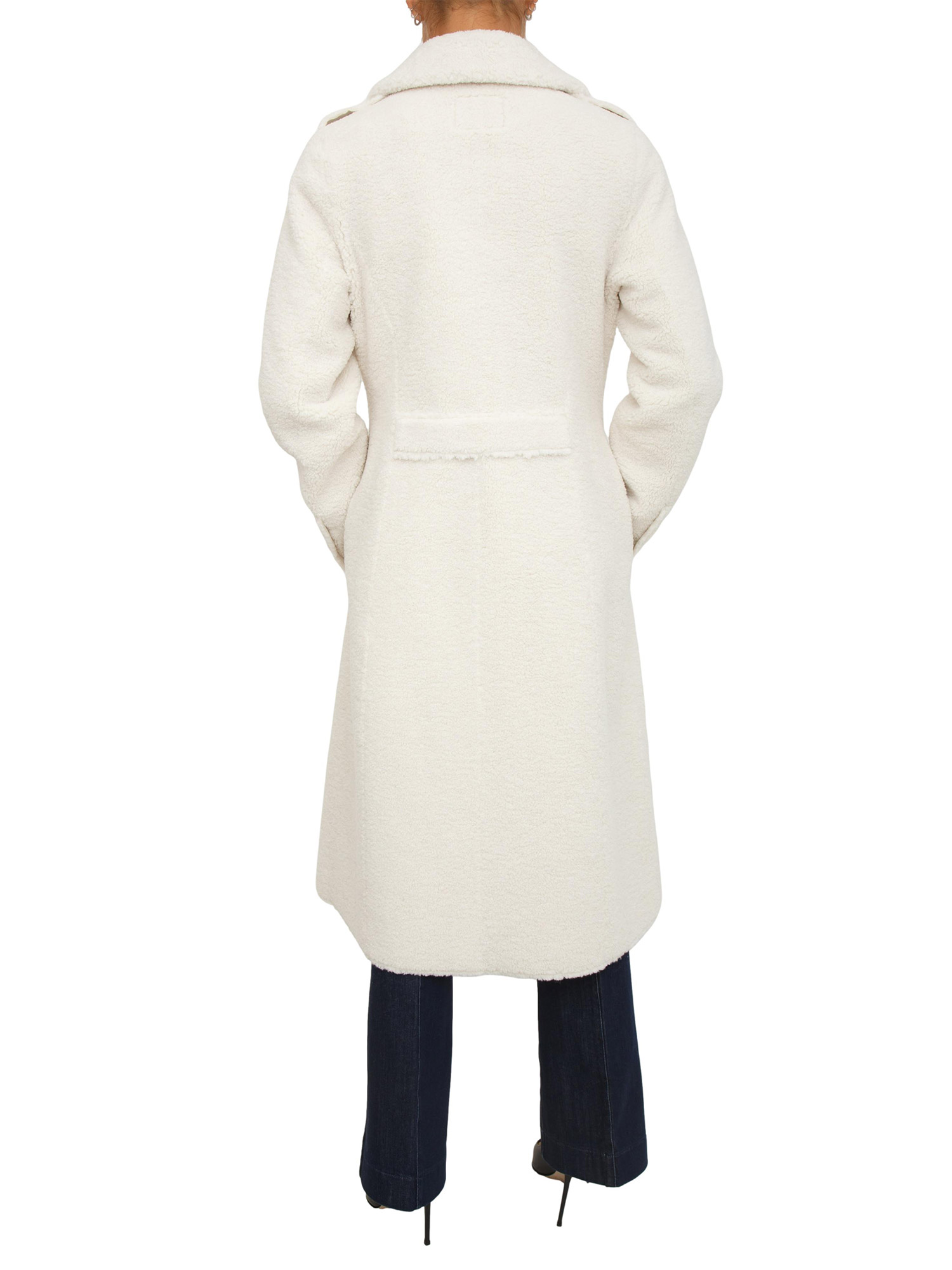 Cappotto lungo Guess Jeans donna realizzato in pelliccia sintetica effetto teddy con ampio revers e chiusura doppiopetto con bottoni oro. La modella è alta 1.72 e indossa la taglia S.