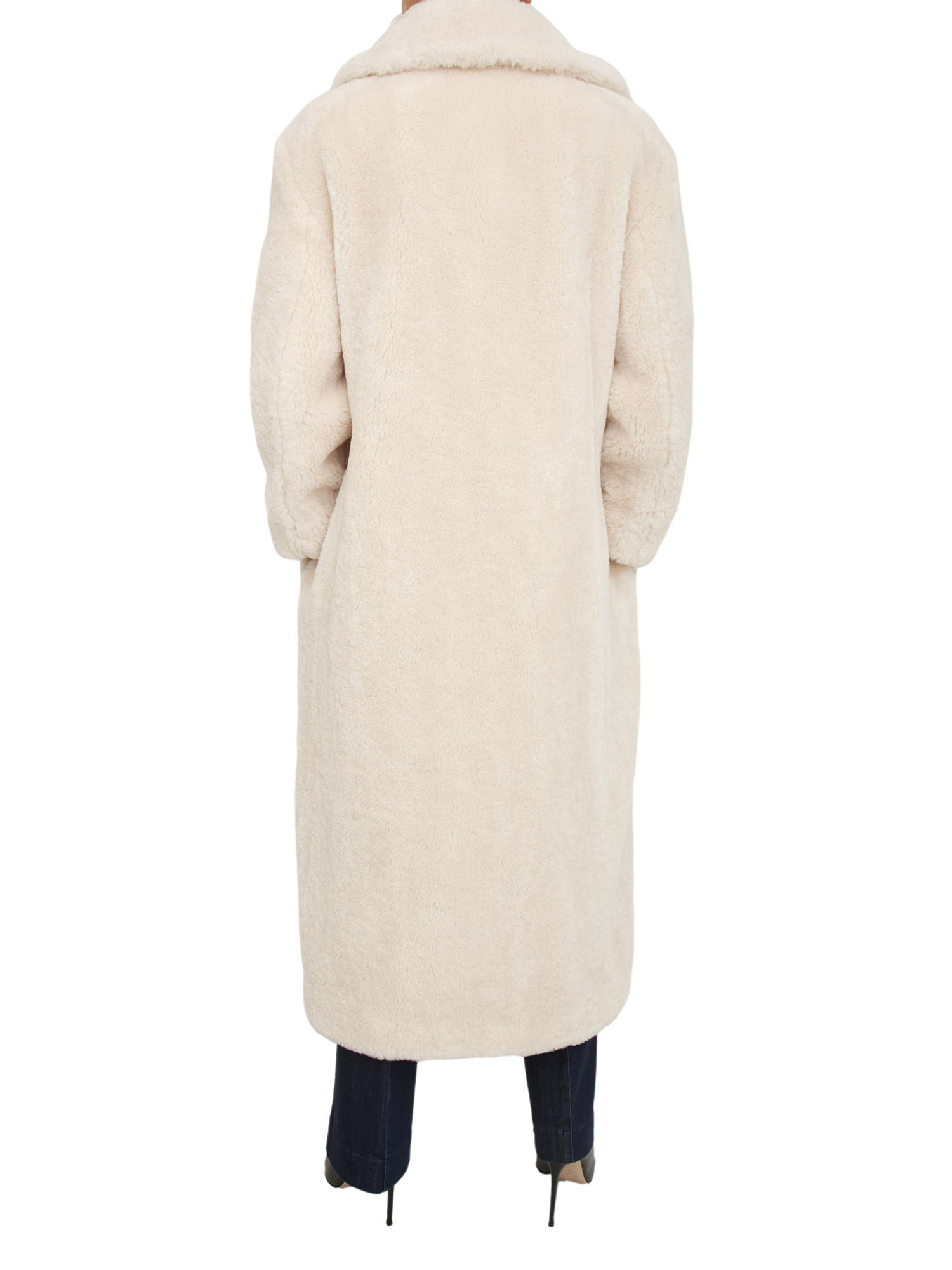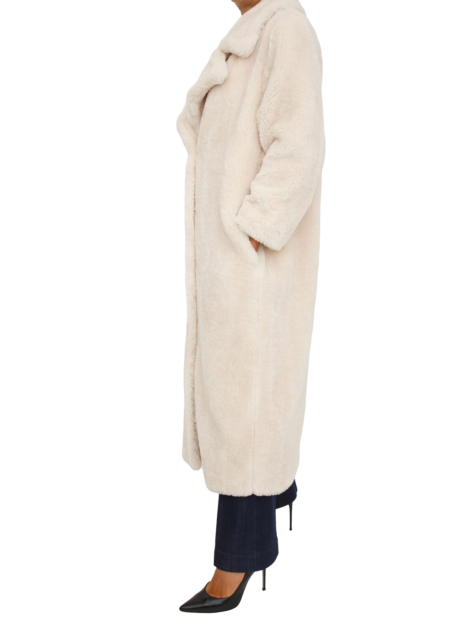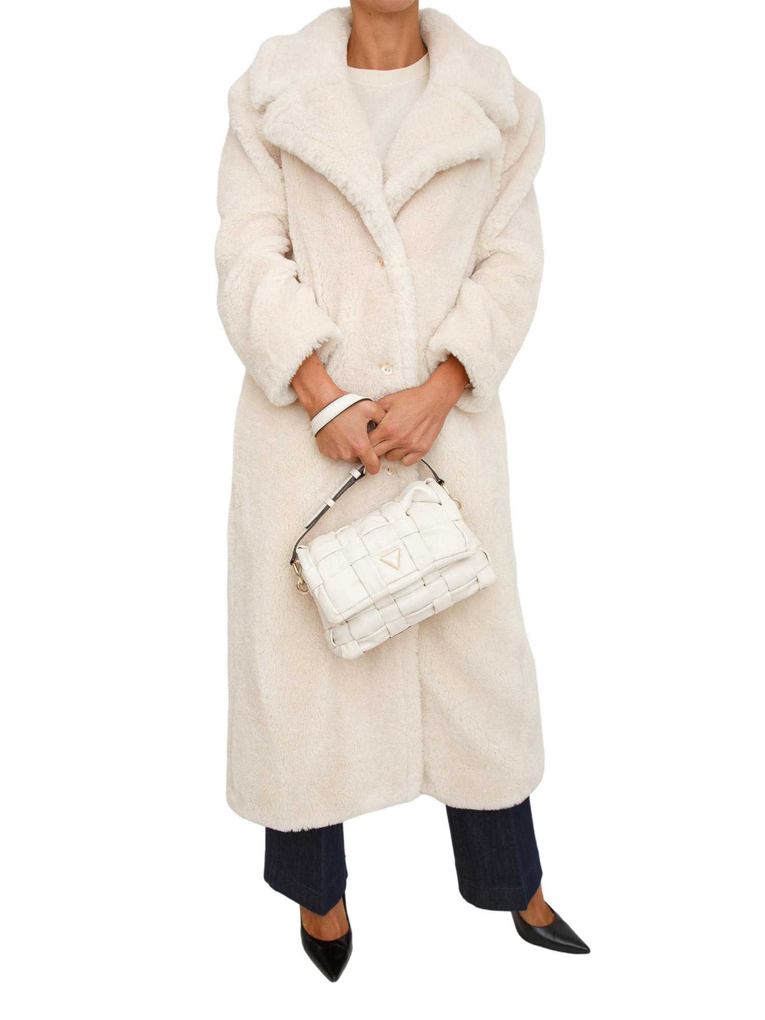 Cappotto lungo in pelliccia sintetica Guess Jeans donna con revers classici e maniche lunghe. Comoda vestibilità regular con chiusura bottoni. La modella è alta 1.72 e indossa la taglia XS.