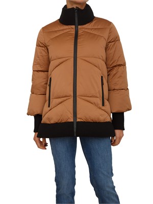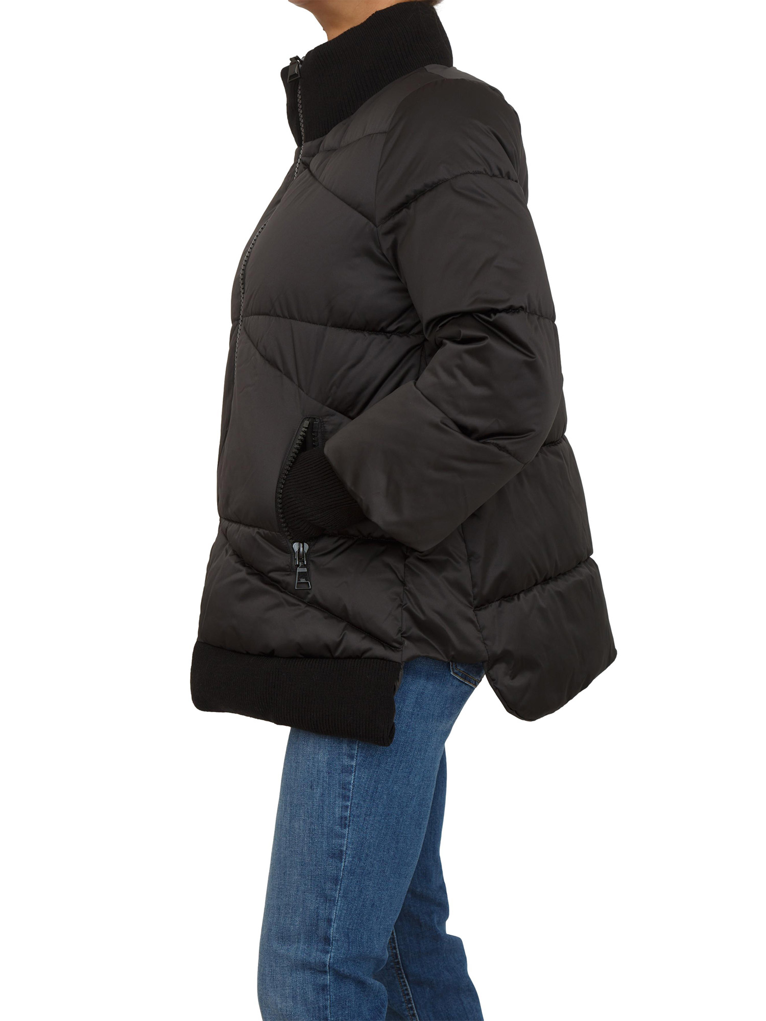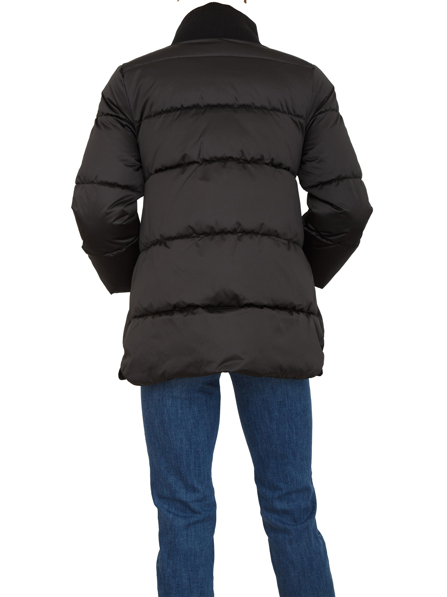 Piumino corto donna Nenette realizzato in tessuto raso, luminoso e sofisticato. I polsini in maglia assicurano comfort e protezione, mentre la linea moderna valorizza ogni look. La modella è alta 1.72 e indossa la taglia 40.