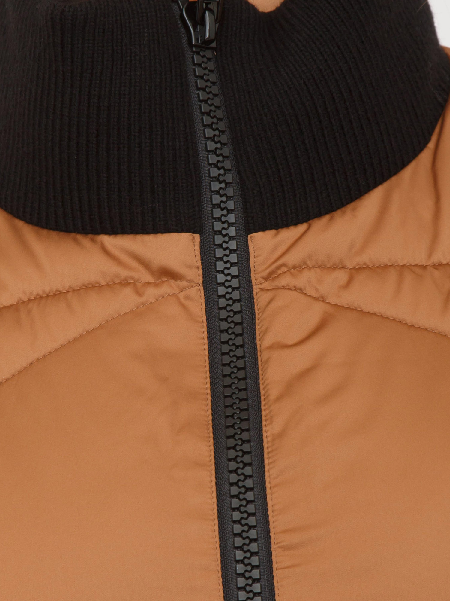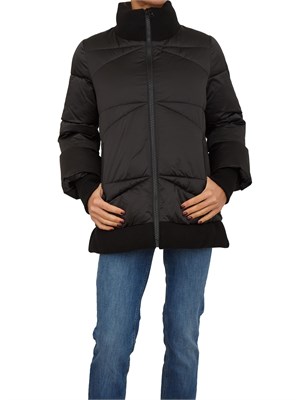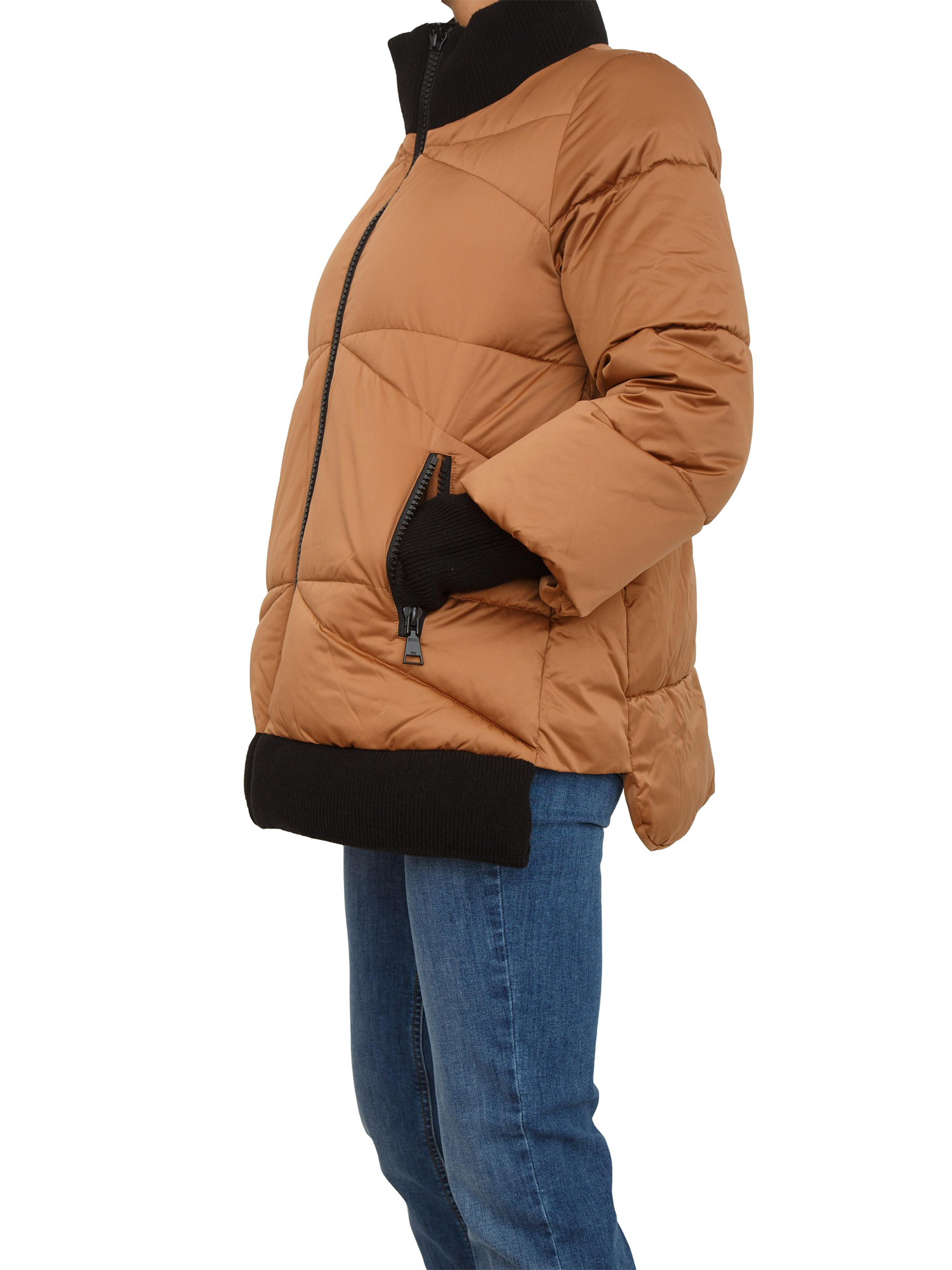 Piumino corto donna Nenette realizzato in tessuto raso, luminoso e sofisticato. I polsini in maglia assicurano comfort e protezione, mentre la linea moderna valorizza ogni look. La modella è alta 1.72 e indossa la taglia 40.